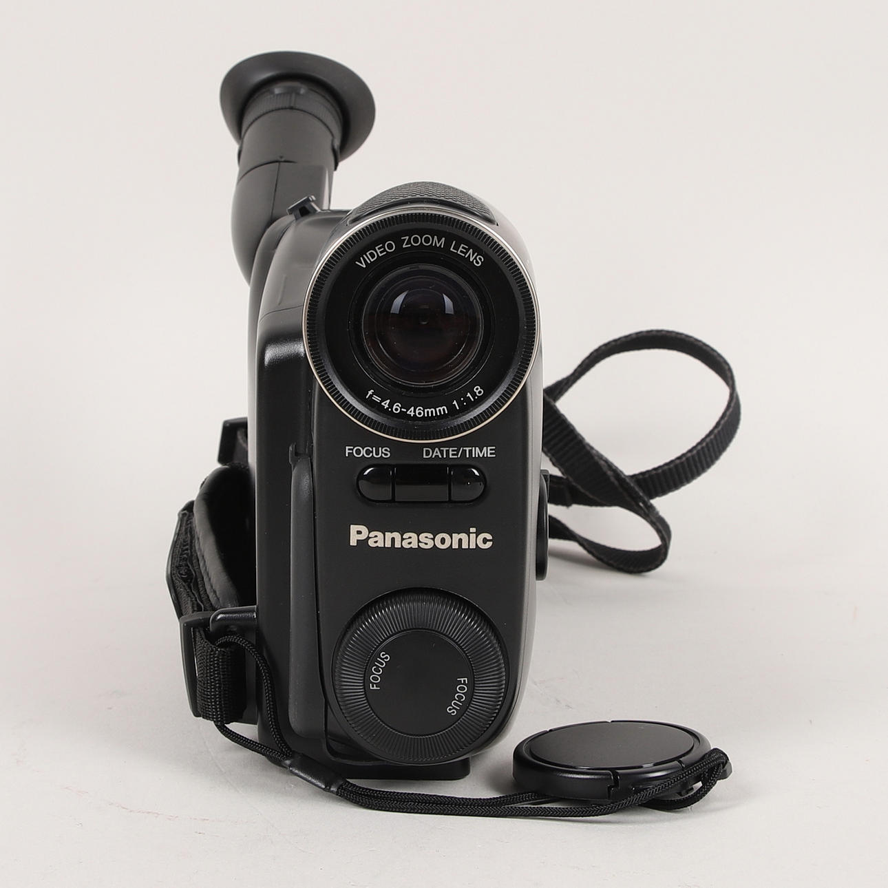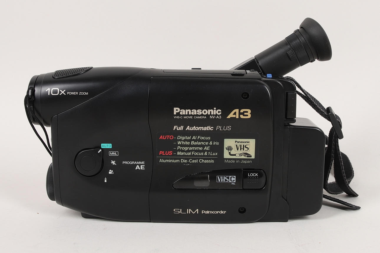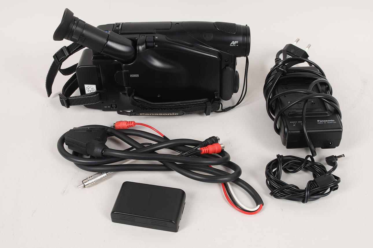 Panasonic-tyyppi NV-A3 laturilla, lisäakulla, kaapelilla ja kotelolla. Mitat noin 23x11x7 cm.