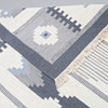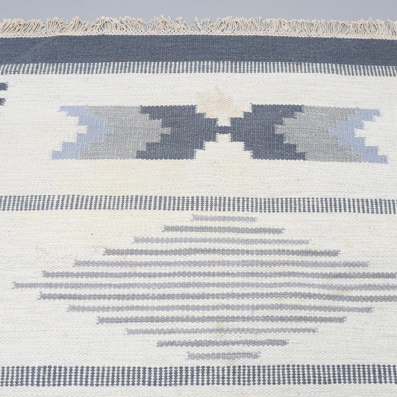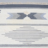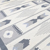 Geometrinen kuvio sinisenä ja valkoisena. 220 x 313 cm ilman hapsuja.