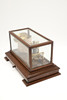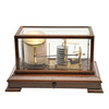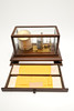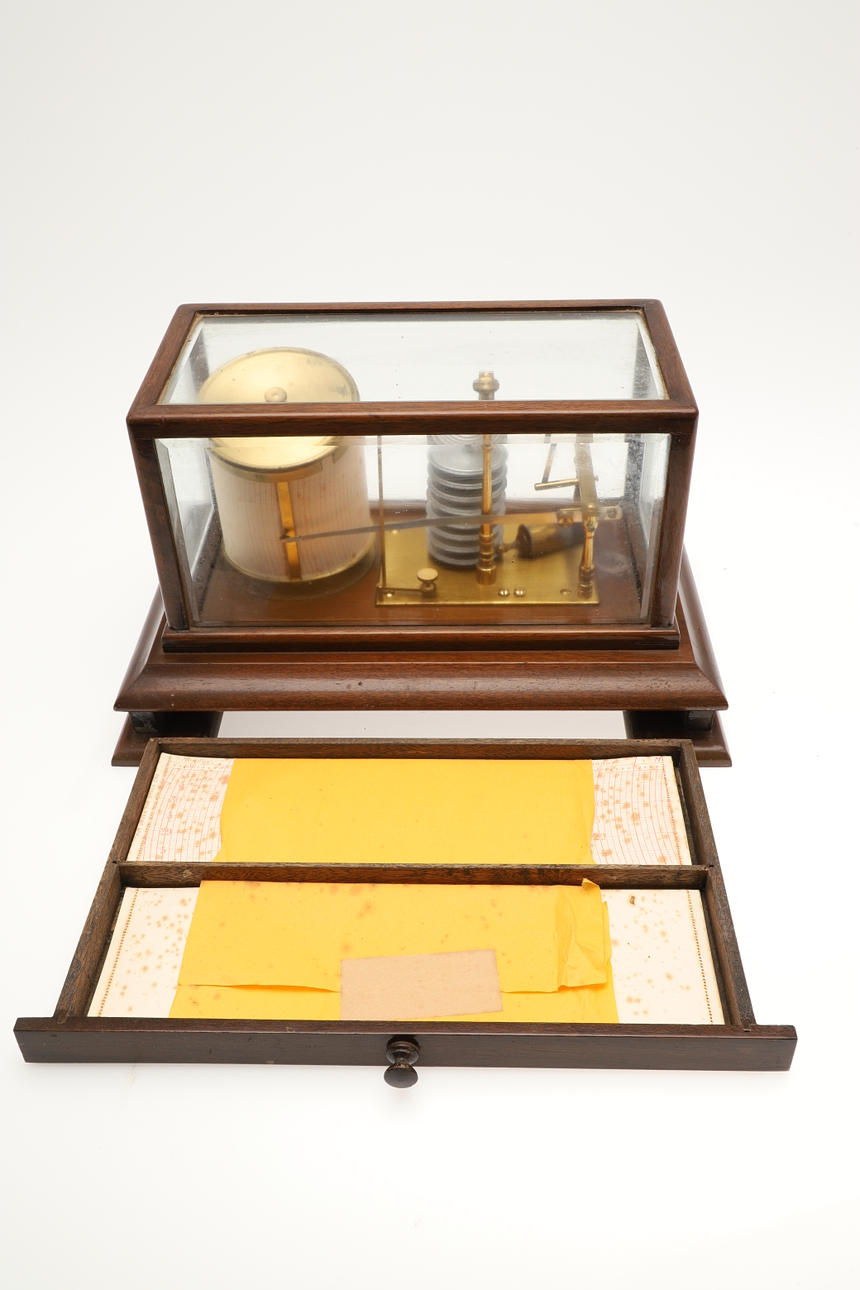 Mahonki- ja lasikuorinen barografi, avainkäämitysmekanismi pyöreässä rummussa, ja laatikko pohjaan. 37 cm halkaisijaltaan.