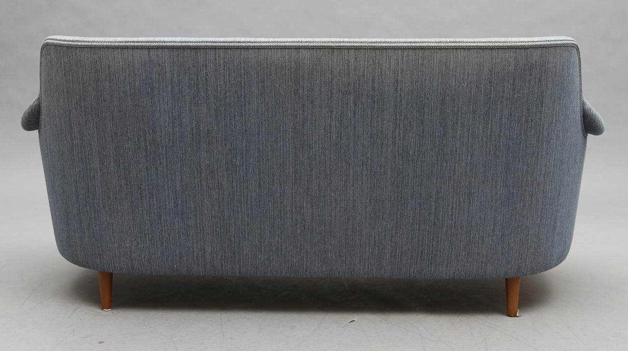Sininen verhoilu. Pituus 176 cm, leveys 57 cm, korkeus 85 cm.