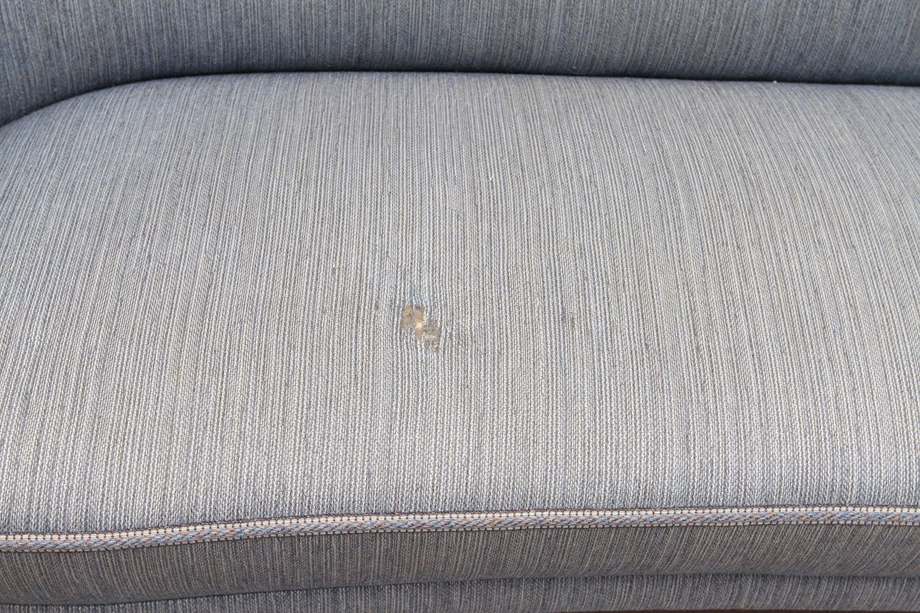 Käyttökuluma. Istuintyynyn verhoilussa pienempiä reikiä.
