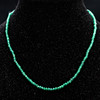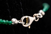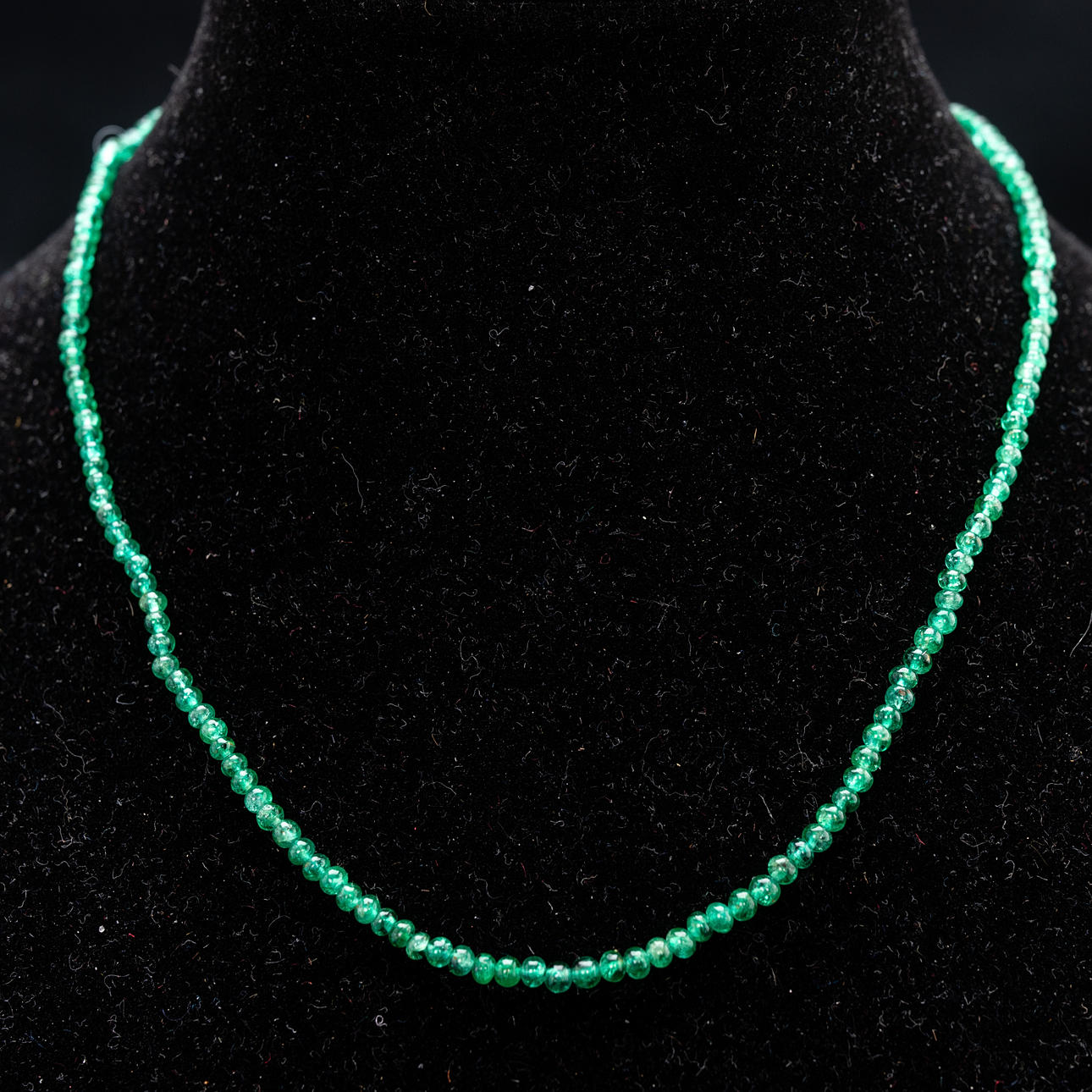 Smaragdihelmikaulakoru, kiinnitetty hopealukolla Mitat n. Smaragdin halkaisija Ø 2,2 mm - 3,2 mm, ketjun pituus 39 cm. Paino lukon kanssa n. 29,50 ct.