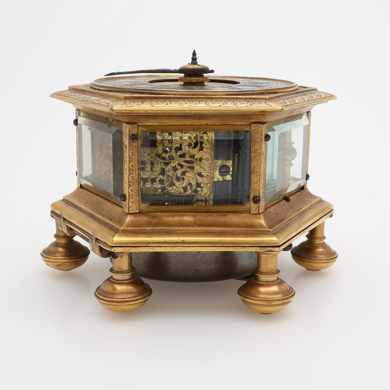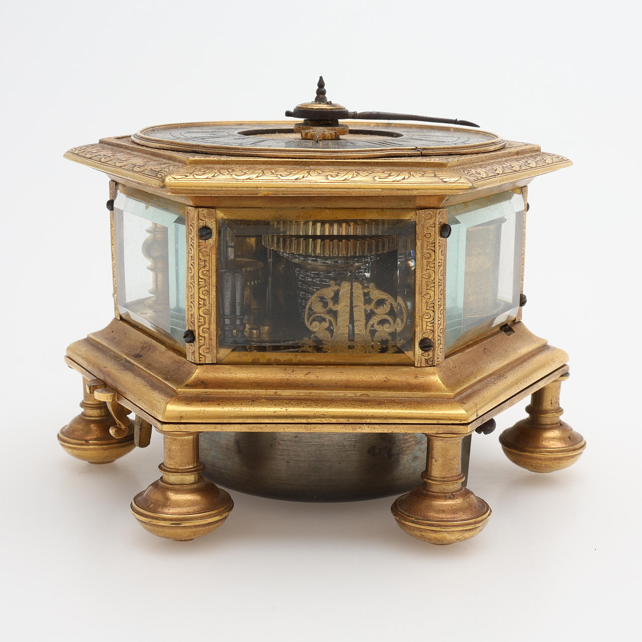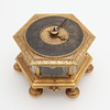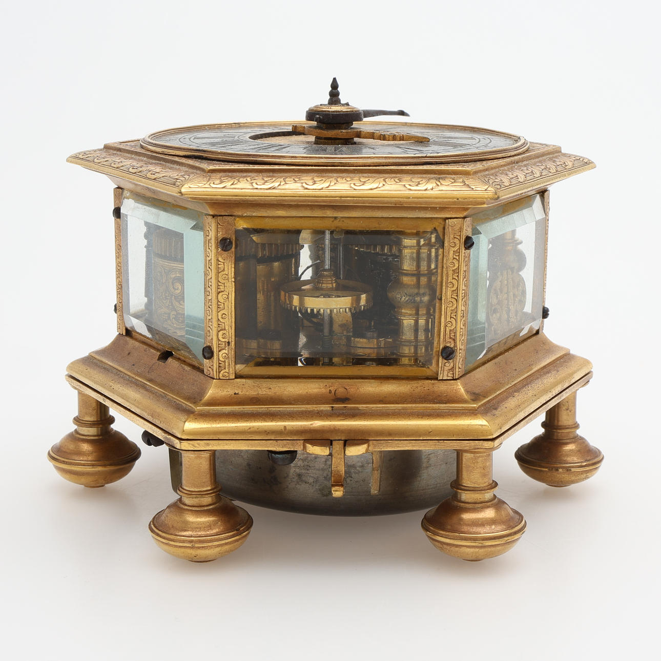 Barokki, Saksa, itsekierteittävä hämähäkkikäytävä, avaimenmääritys, ca 1700, kullattua messinkiä viistolasikaseteilla. Sarjanumero 233, halkaisija 103 mm, korkeus 77 mm.