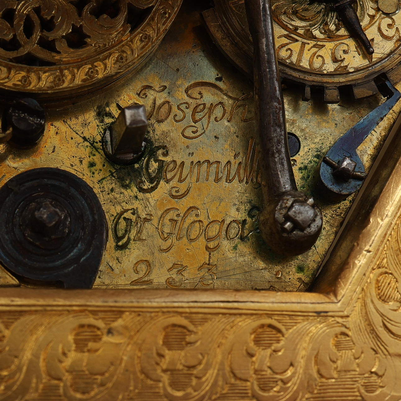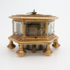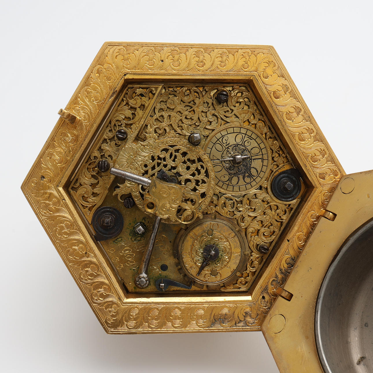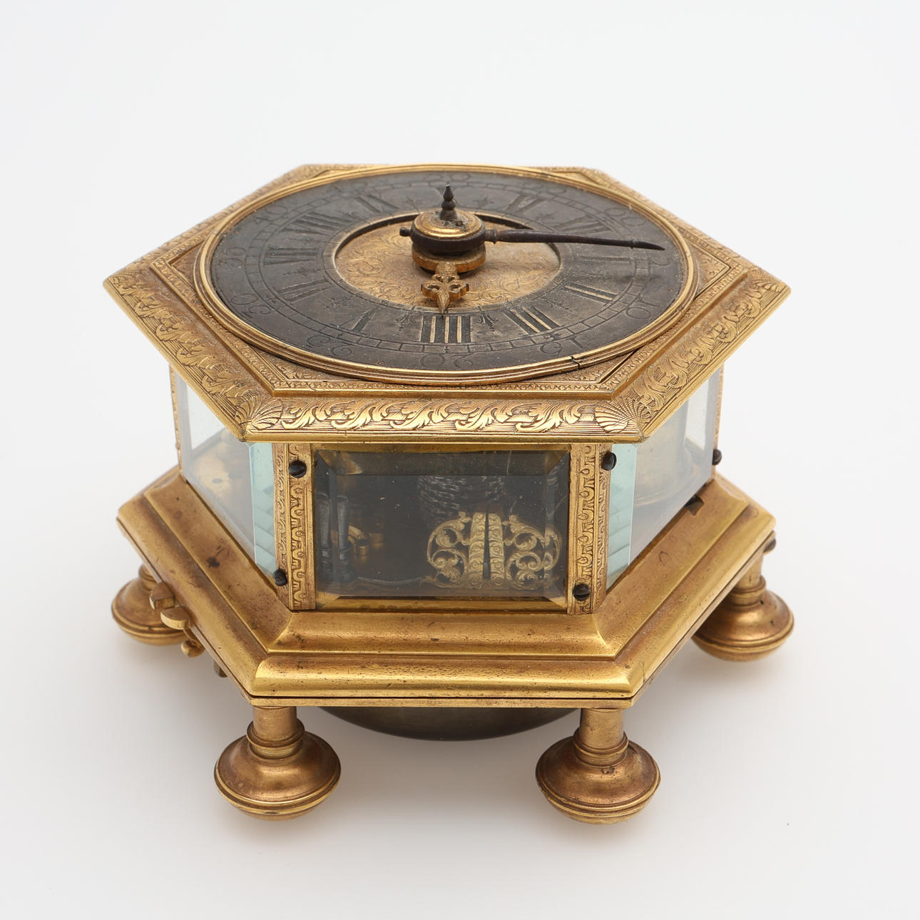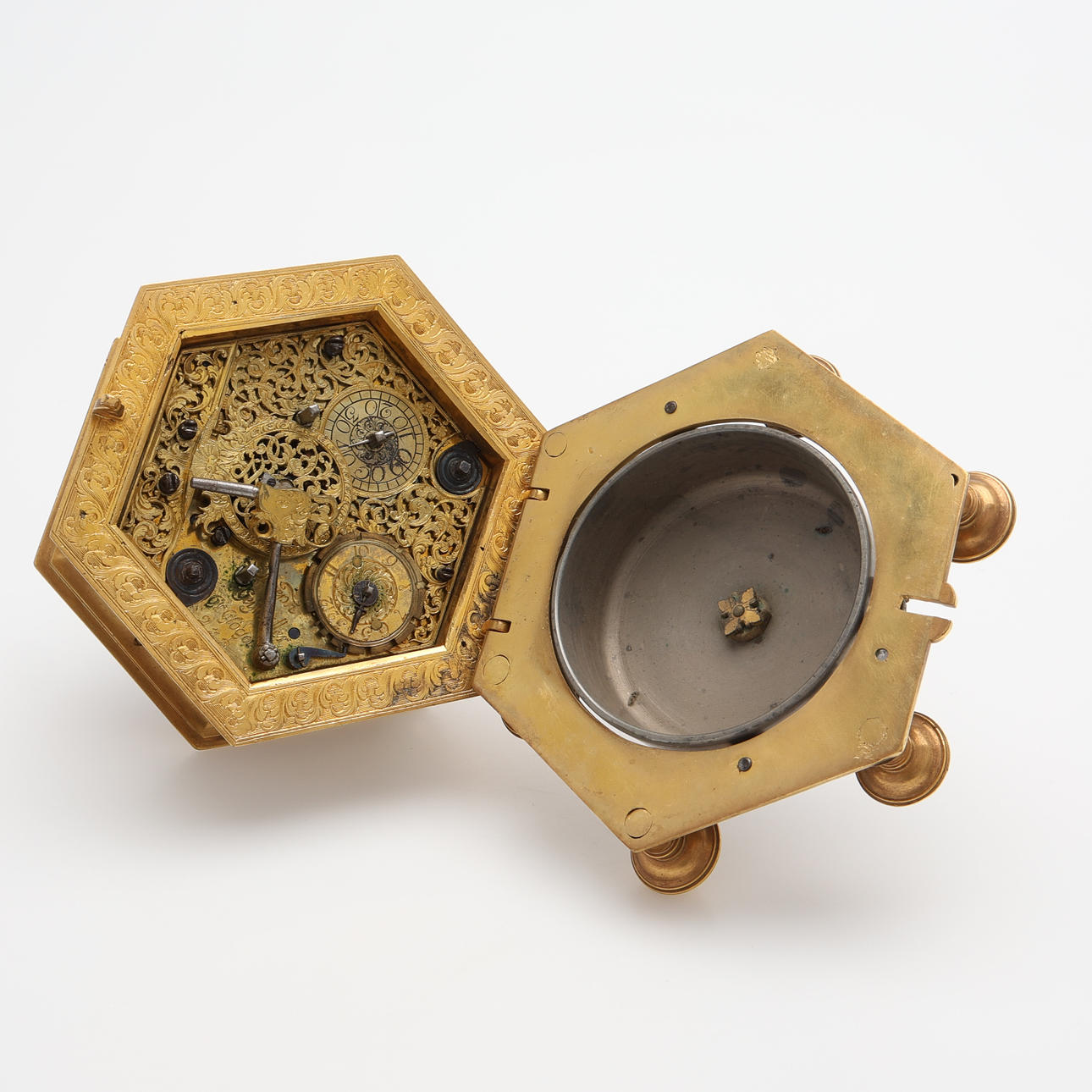 Barokki, Saksa, itsekierteittävä hämähäkkikäytävä, avaimenmääritys, ca 1700, kullattua messinkiä viistolasikaseteilla. Sarjanumero 233, halkaisija 103 mm, korkeus 77 mm.