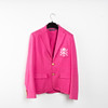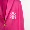 Ceriserosa-puuvillatrikoosa, jossa kirjailtu tunnus rintataskussa. Kaksi taskua, joissa on kansi. Kaulus lyönneillä. Rinnanleveys n. 80 cm. Takapituus n. 63 cm.