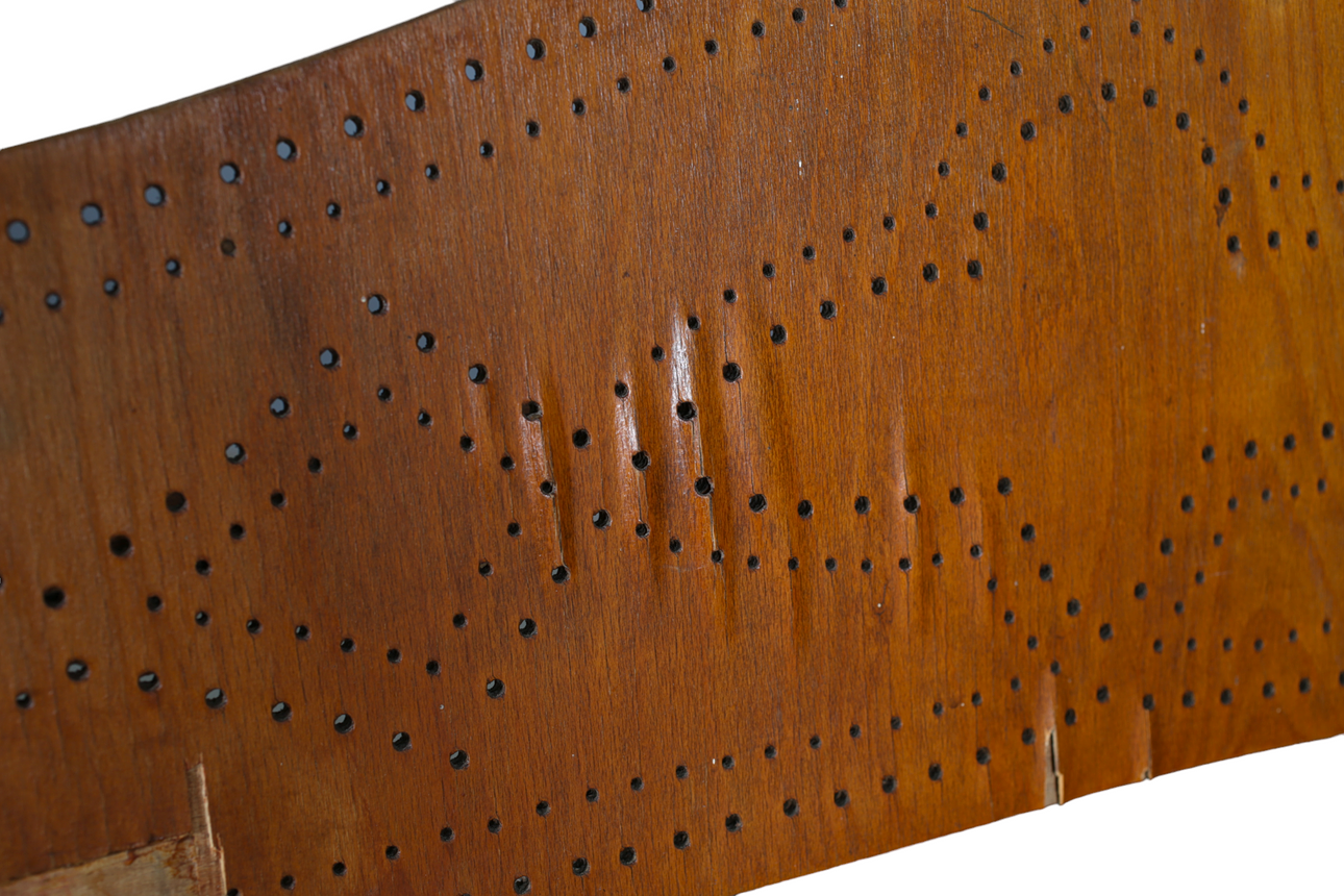 Selkänojan ja istuimen viiluvauriot, selässä on noussut viilu, kuluminen, kuivat halkeamat (katso kuvat).