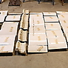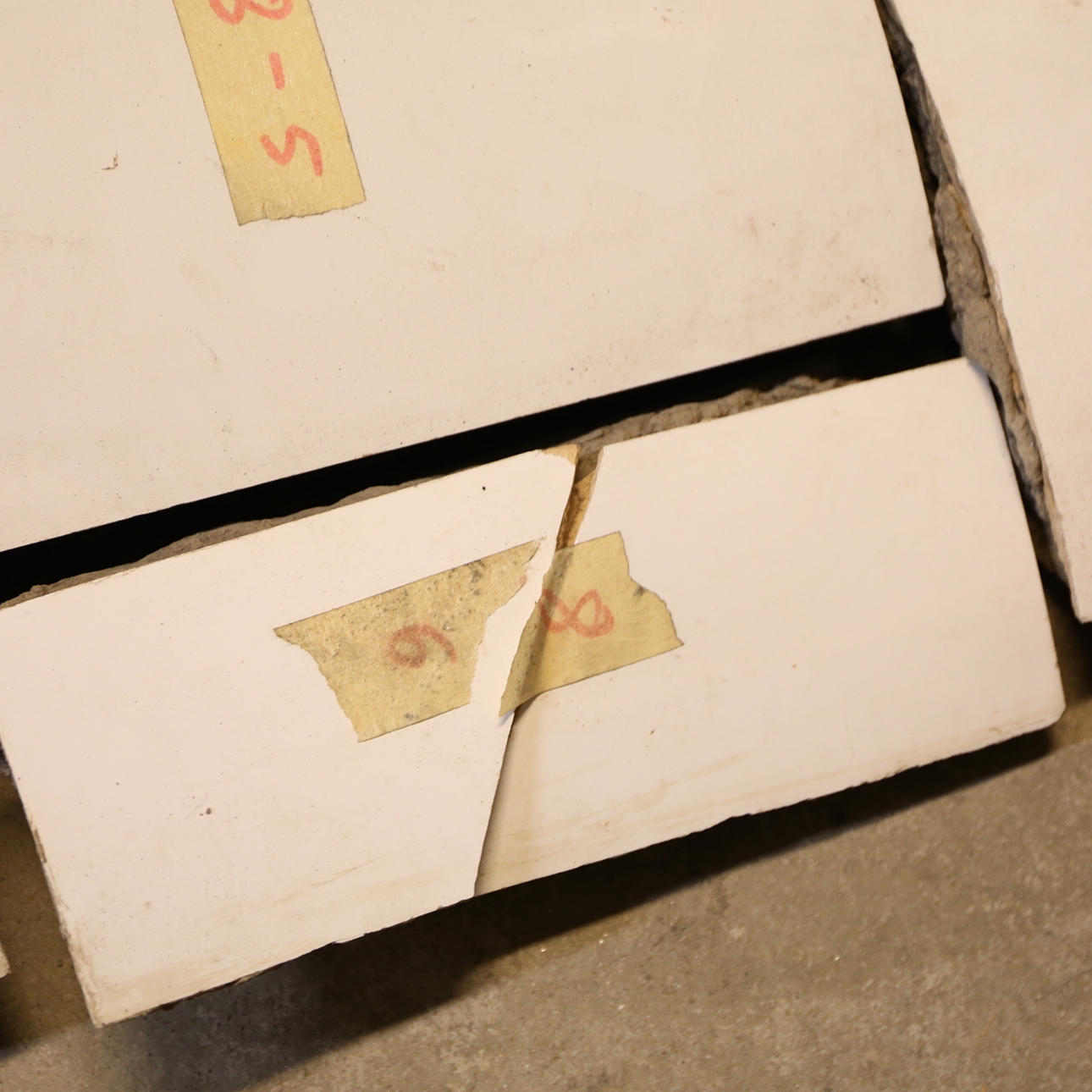 Vauriot, halkeamat, isot vauriot 6-4 vasemmassa kulmassa. Laatat 8-6 täysin erillään, Käyttökuluma.