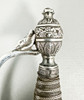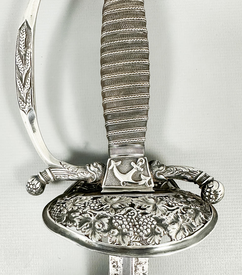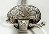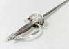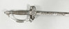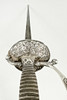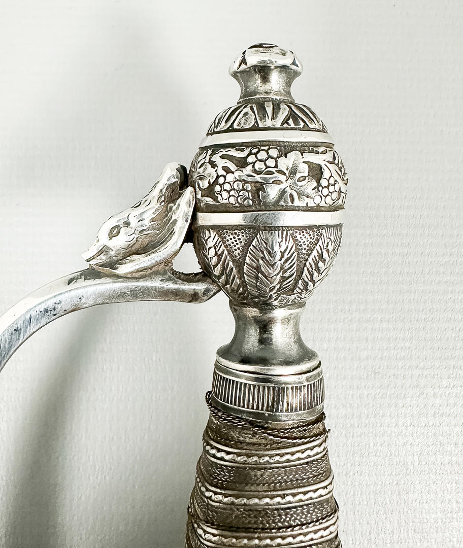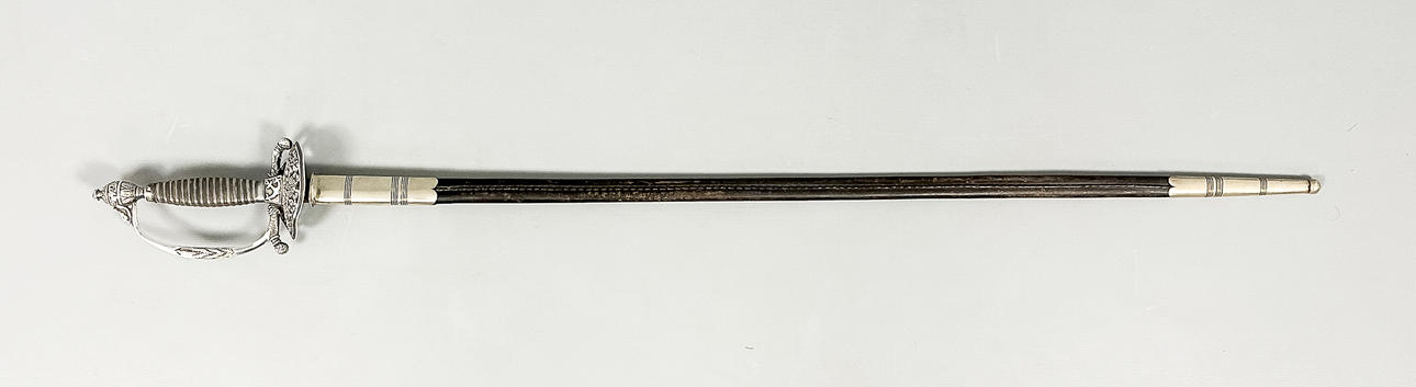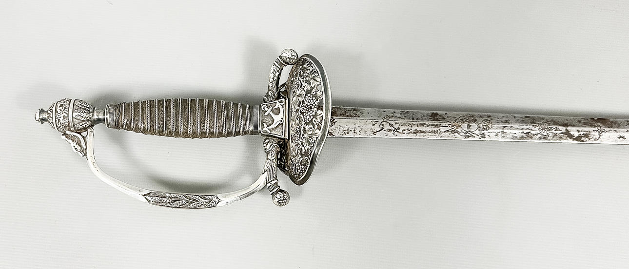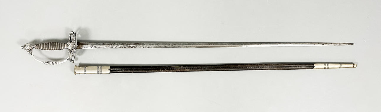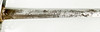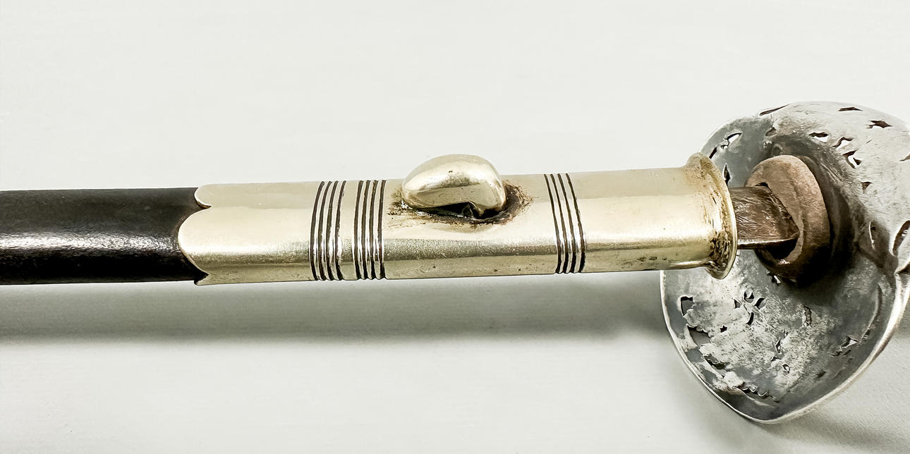 Vierintätappi, pusero ja nuppi hopeaa. Nahkainen kylpyamme. Kokonaispituus 100 cm, terän pituus 83,5 cm. Kaiverrettu terä.