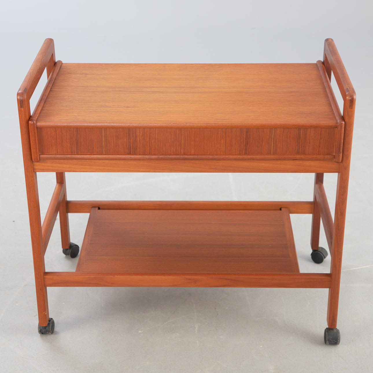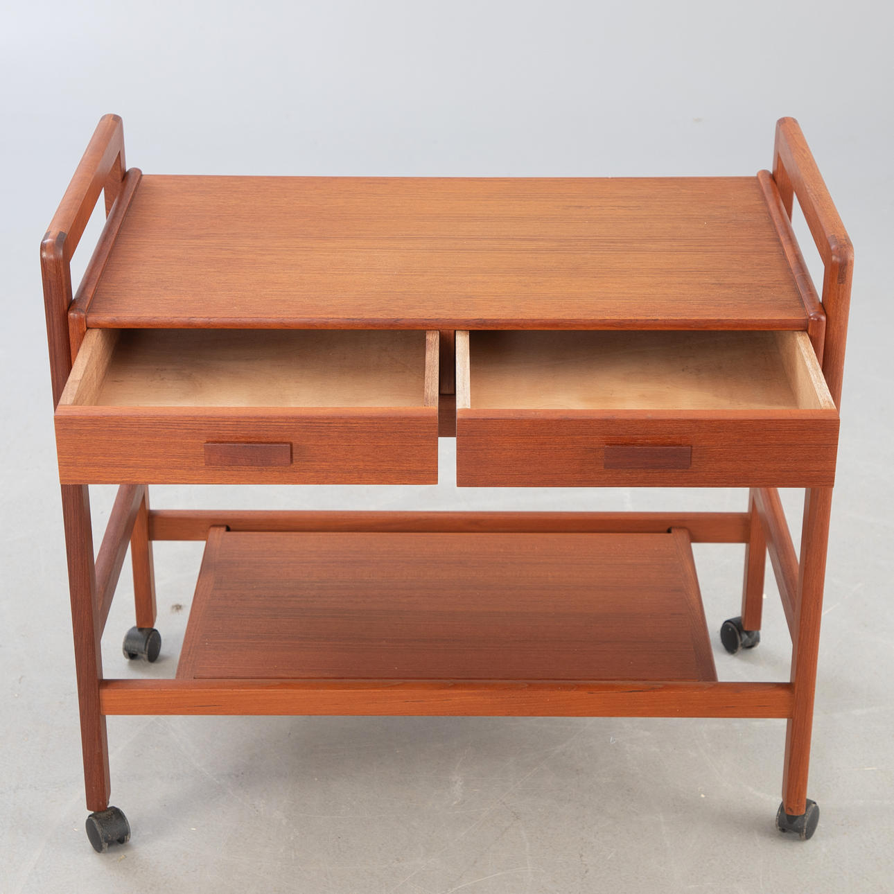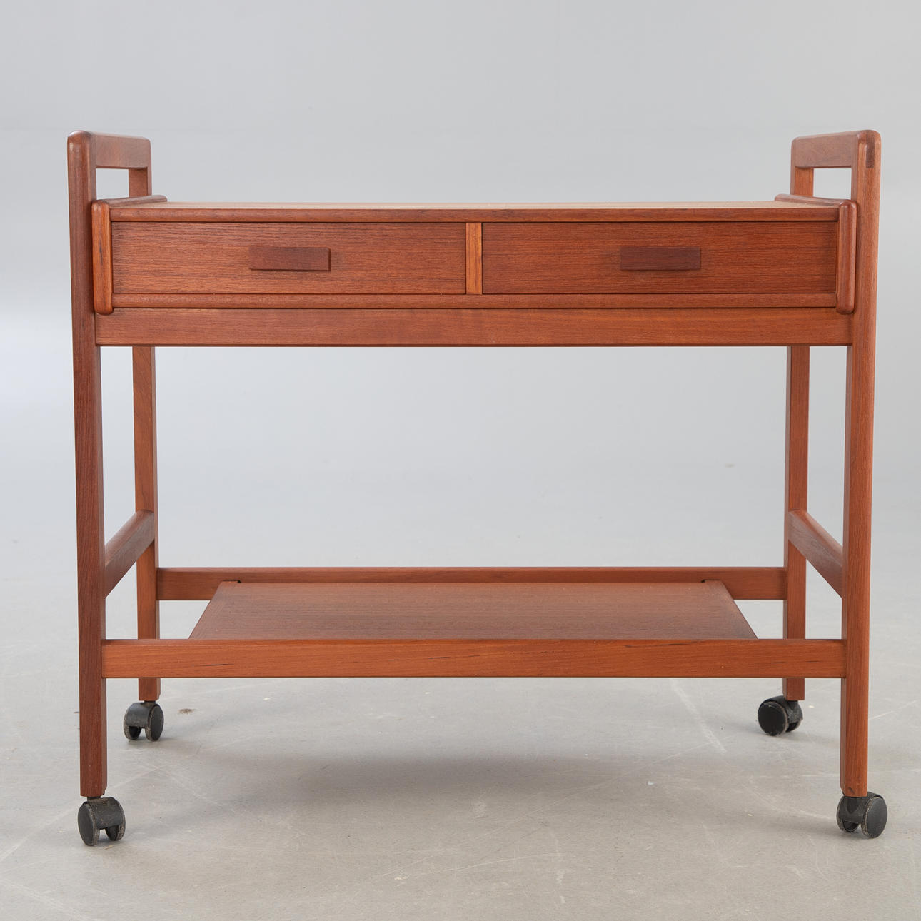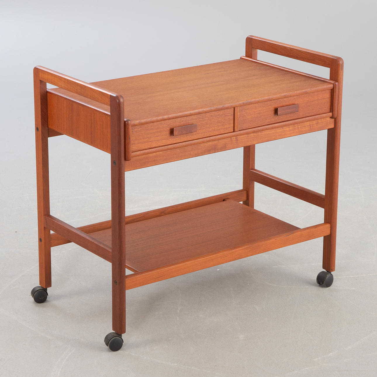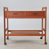 tiikkipuu Baarikärry, jossa 2 tasoa ja 2 laatikkoa. Pyörillä.
