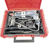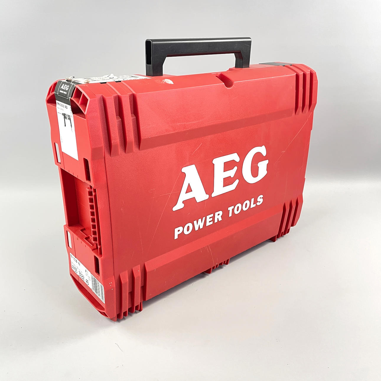 Porakone AEG lisävarusteineen kannettavassa muovilaatikossa. Pituus n. 40 cm.