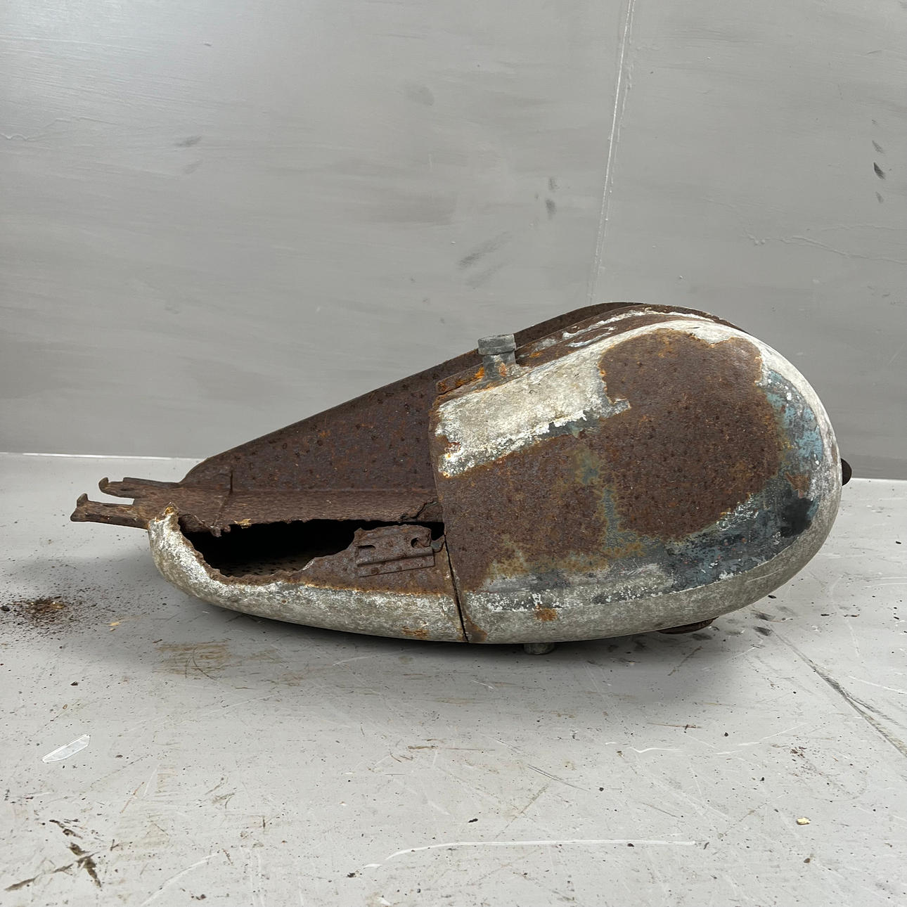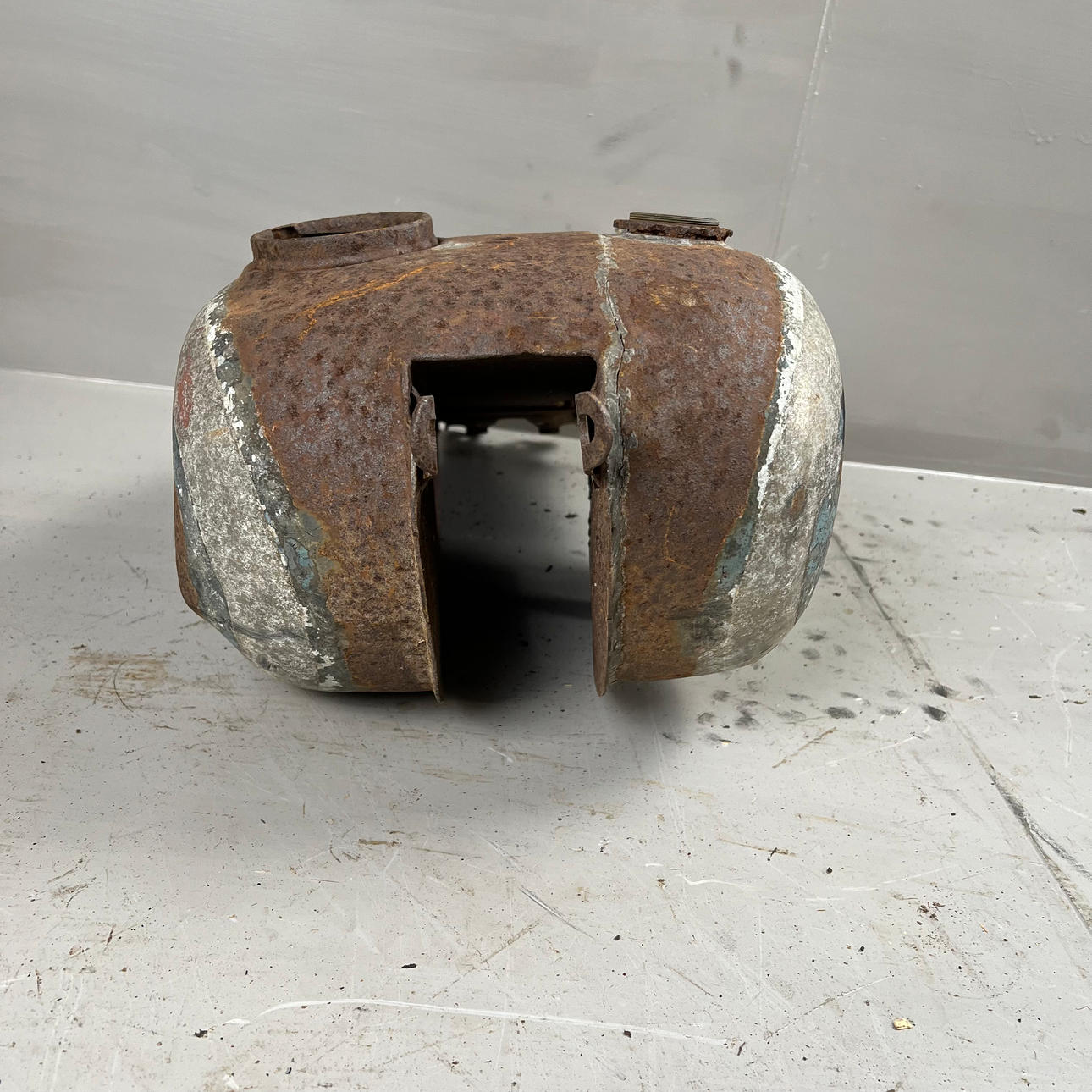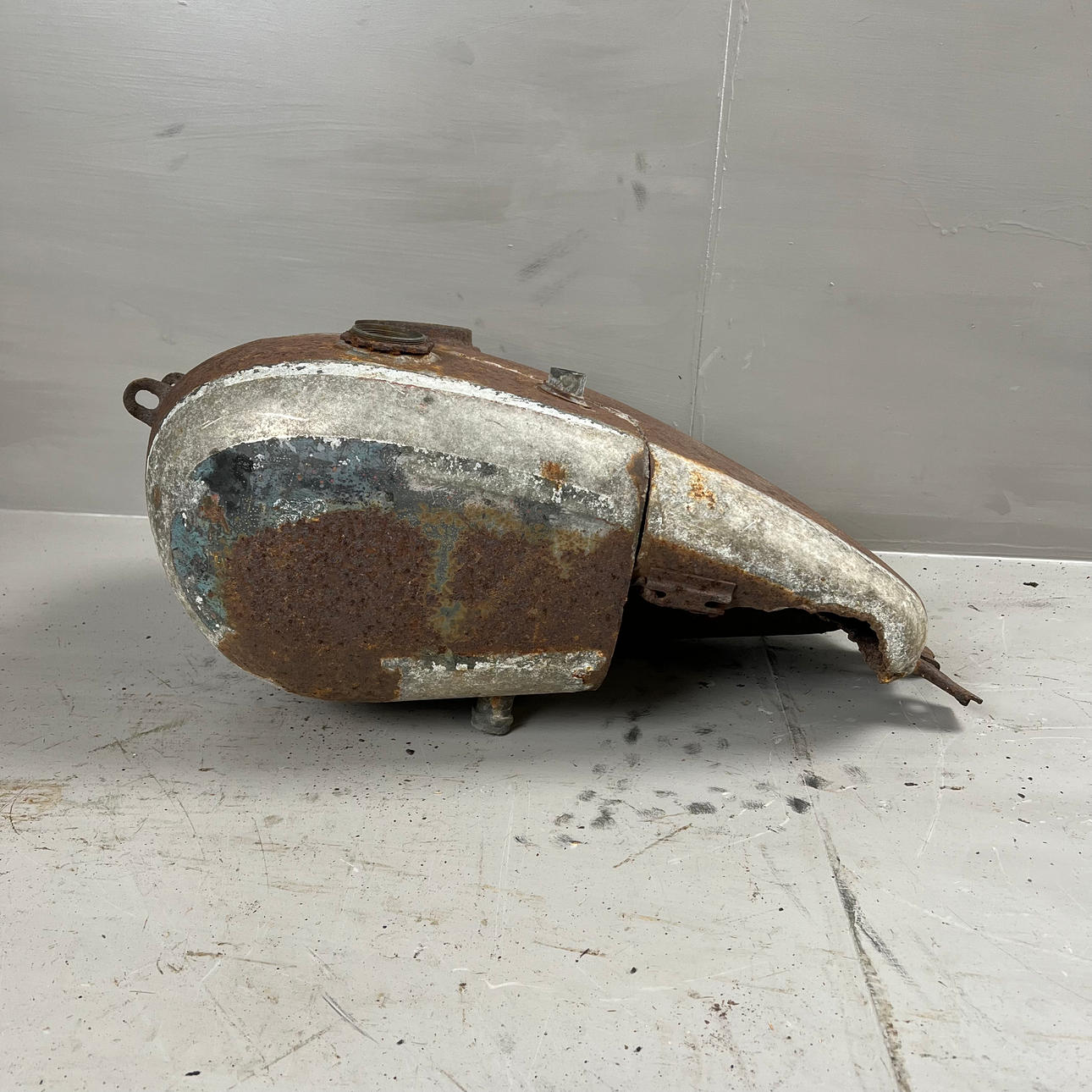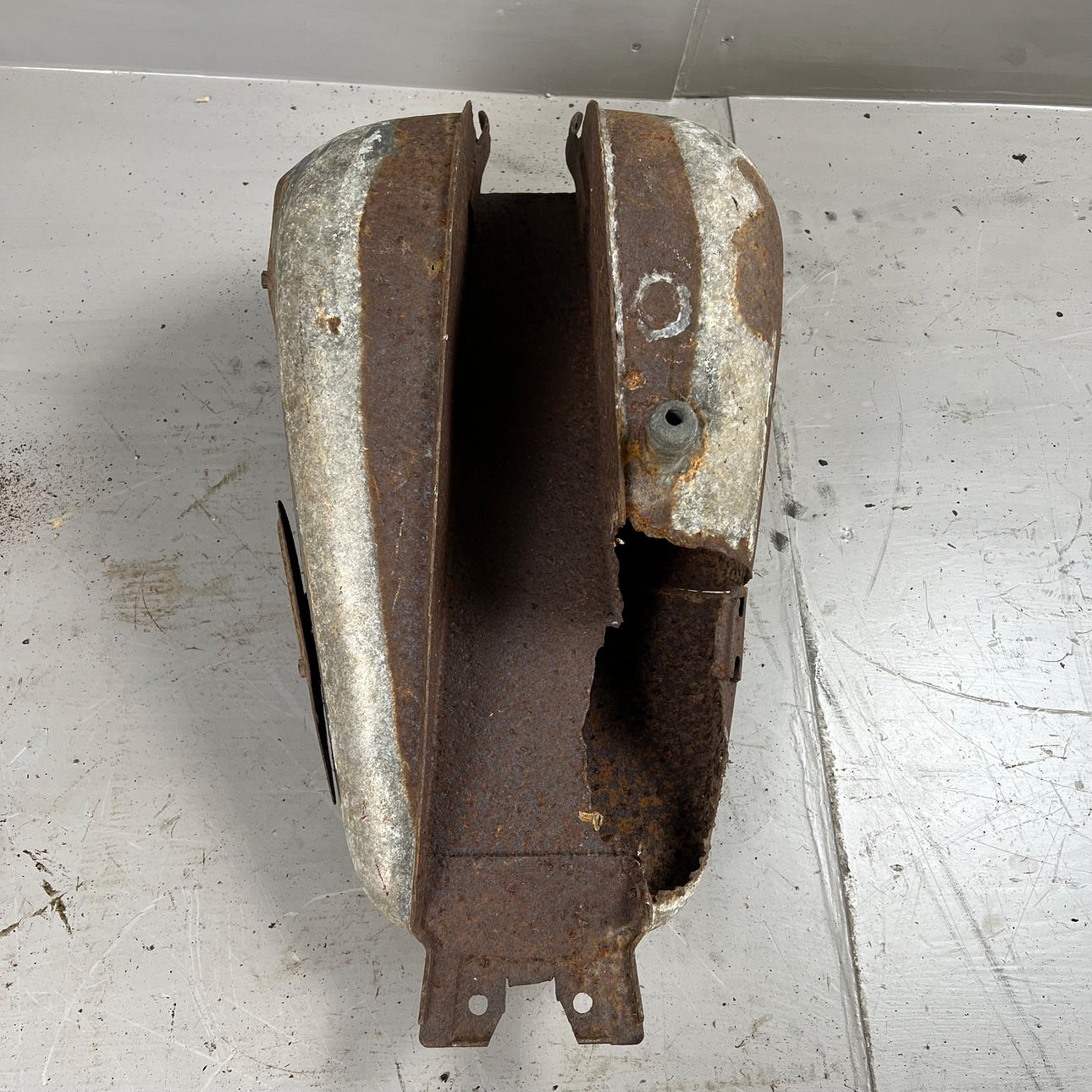 Polttoainesäiliö on vaurioitunut pahasti ruosteesta ja leikatusta osasta.