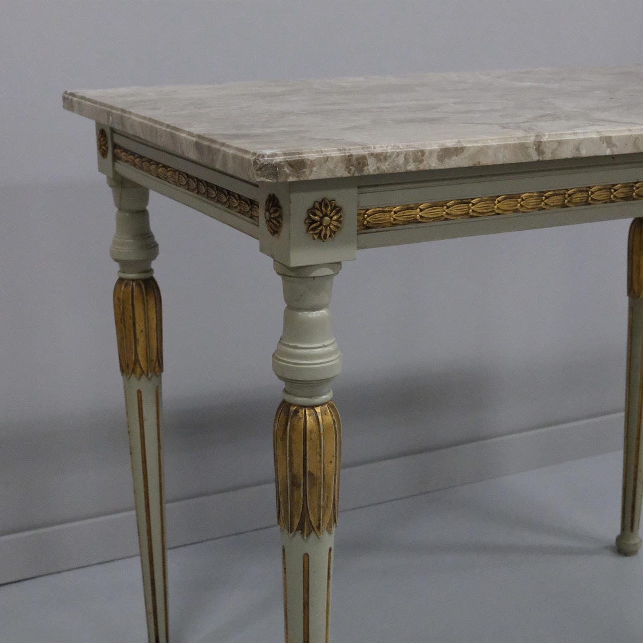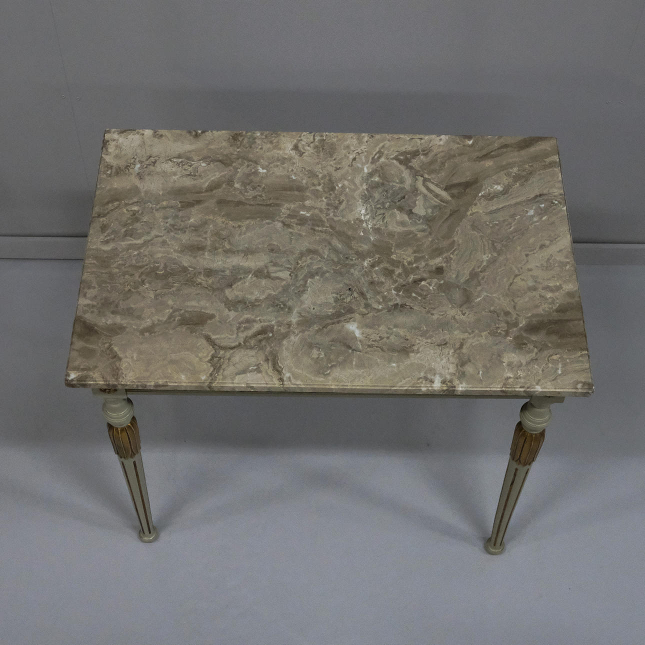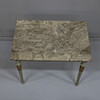 Harmaaksi maalattu ja pronssattu, kalkkikivekko, kanylöidyt ja lehtikoteloidut jalat, reunukset ja rusetit, luultavasti Johan Ekman, Malmö, 1900-luvun alkupuoli, korkeus 75, 87x54 cm.