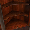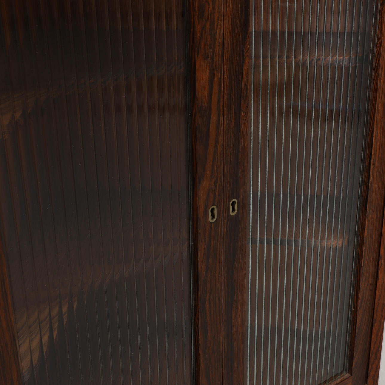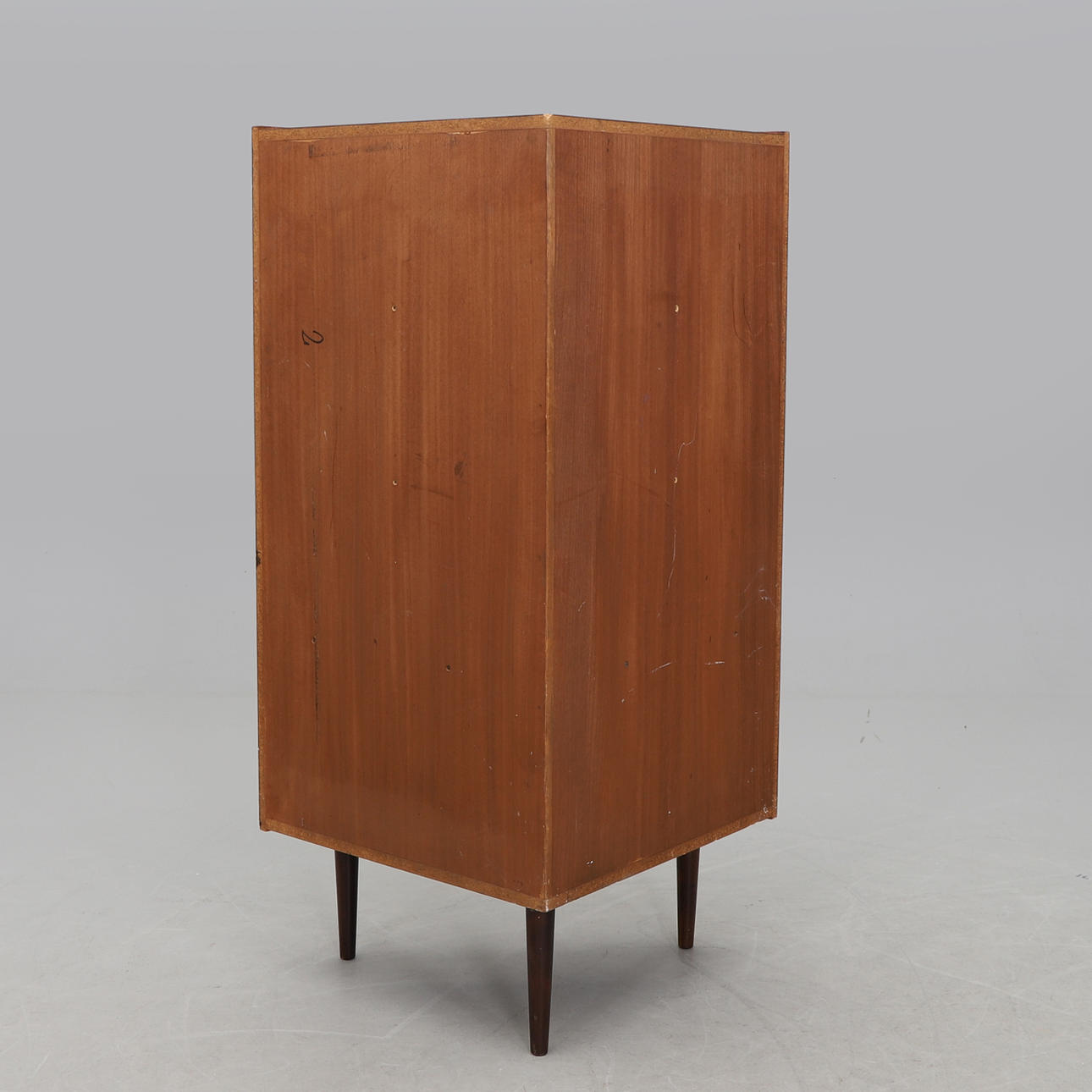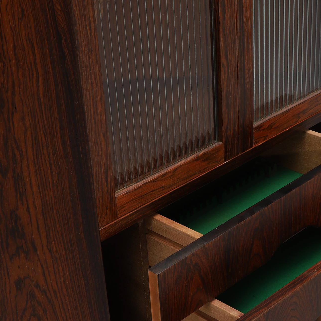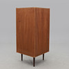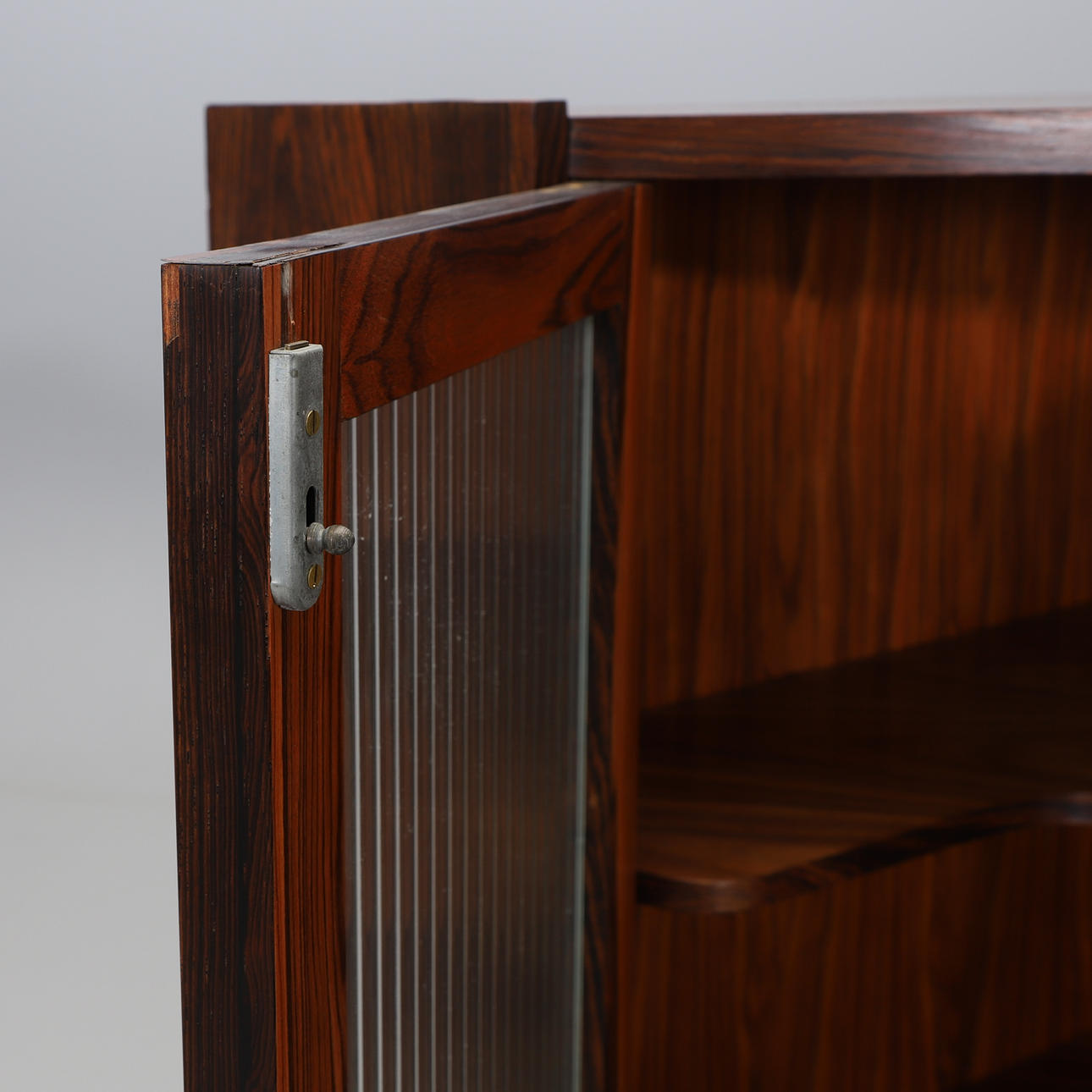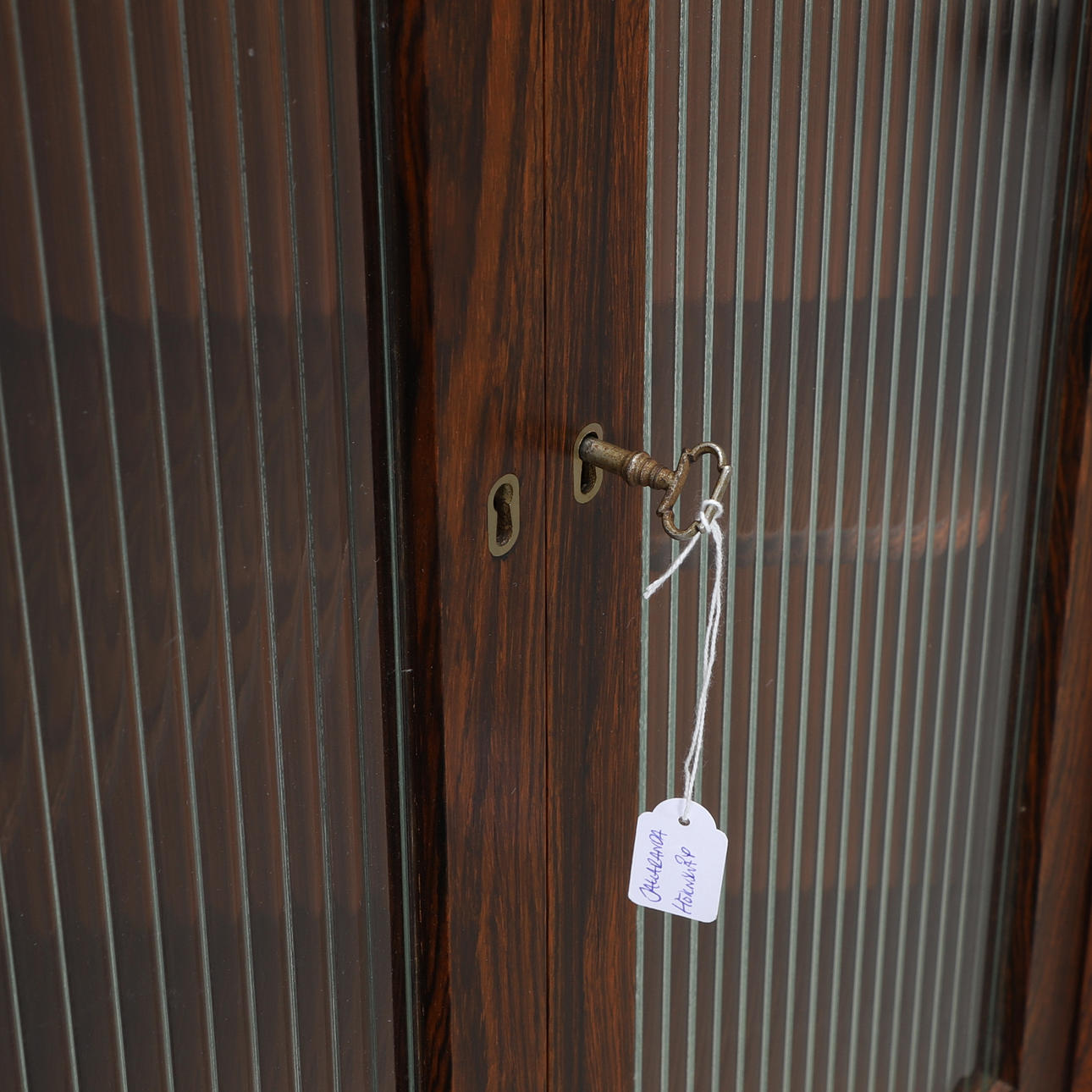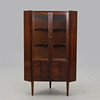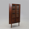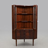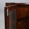 Viilutettu jakarandassa. Edessä pari ovea. Takahyllyillä. Kolmen laatikon alla. Leveys 86 cm. Syvyys 51 cm. Korkeus 138 cm.