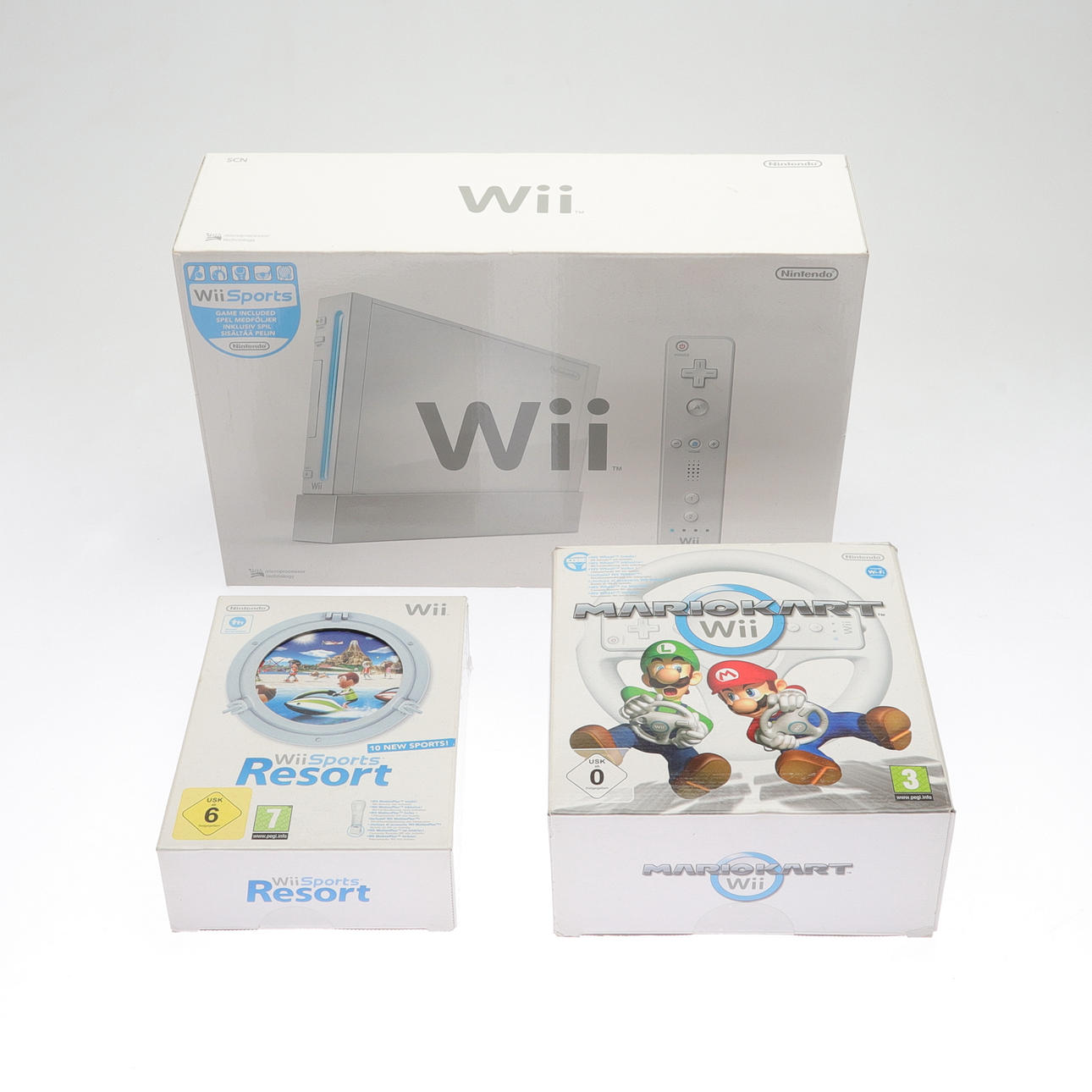 Mukana 3 laatikkoa, 13 peliä ja 2 Wii-pyörää.