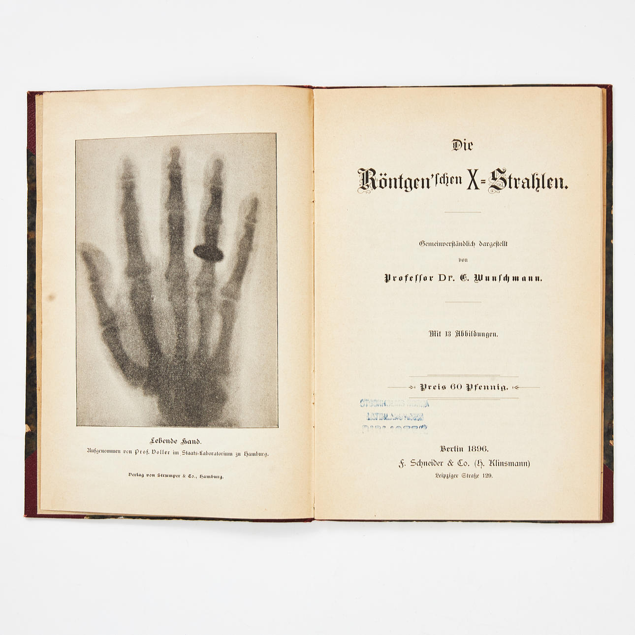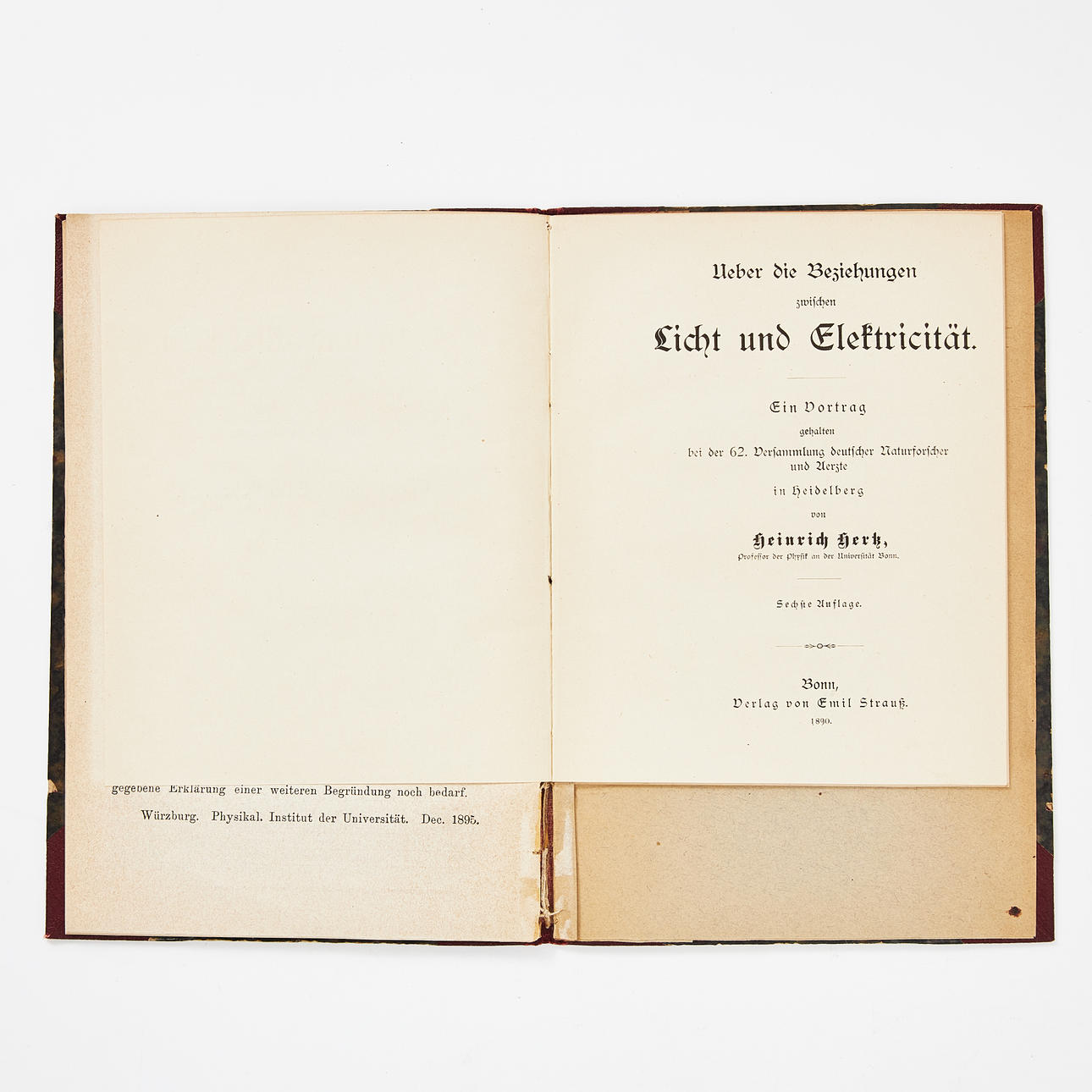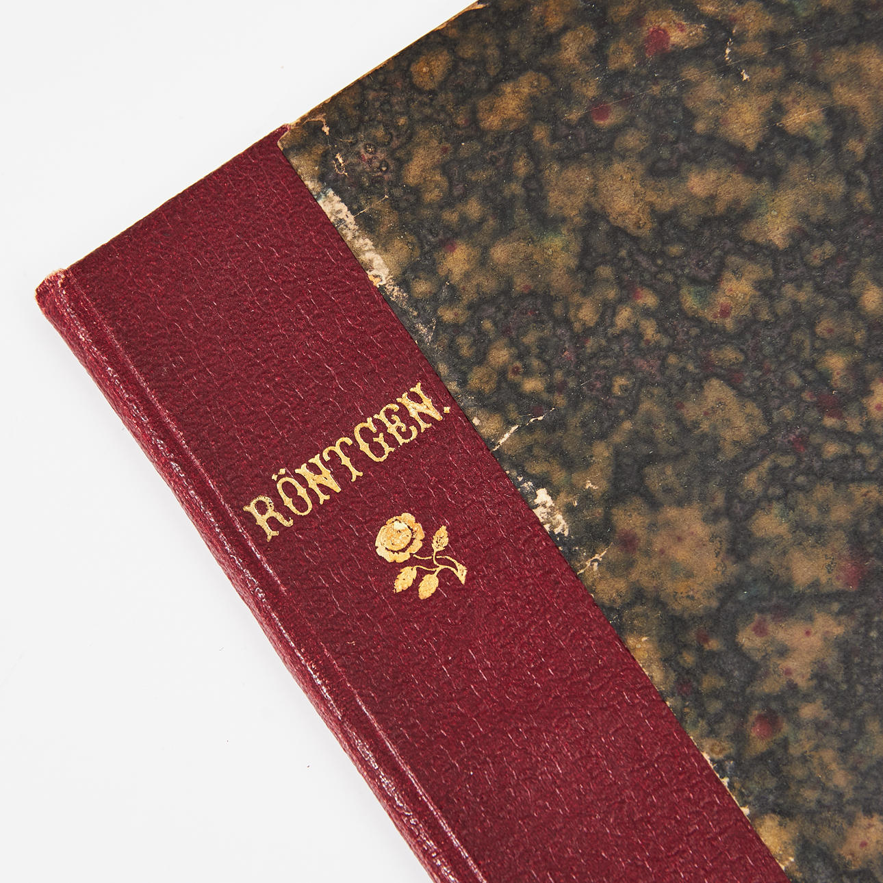 WUNSCHMANN, E.Röntgen'schen X-Strahlen. Yleisesti sanottuna. Berliini 1896. 210 x 145 mm. + RÖNTGEN, WILHELM KONRAD. Uusi strahlen-taide. Würtzburg vuonna 1896. 210 x 145 mm. + HERK, HEINRICH. Käytä valaistuksen ja sähkön välisiä olosuhteita. Bonn vuonna 1890. 170 x 133 mm. Hieman kulunut nykyaikainen puoliransalainen bändi marmoroiduilla sideaineilla. Nimi Röntgen ja etukannessa kultainen kukka. Allekirjoitus kansilehdellä. Postimerkit kahden ensimmäisen teoksen otsikkoarkkeissa.