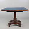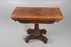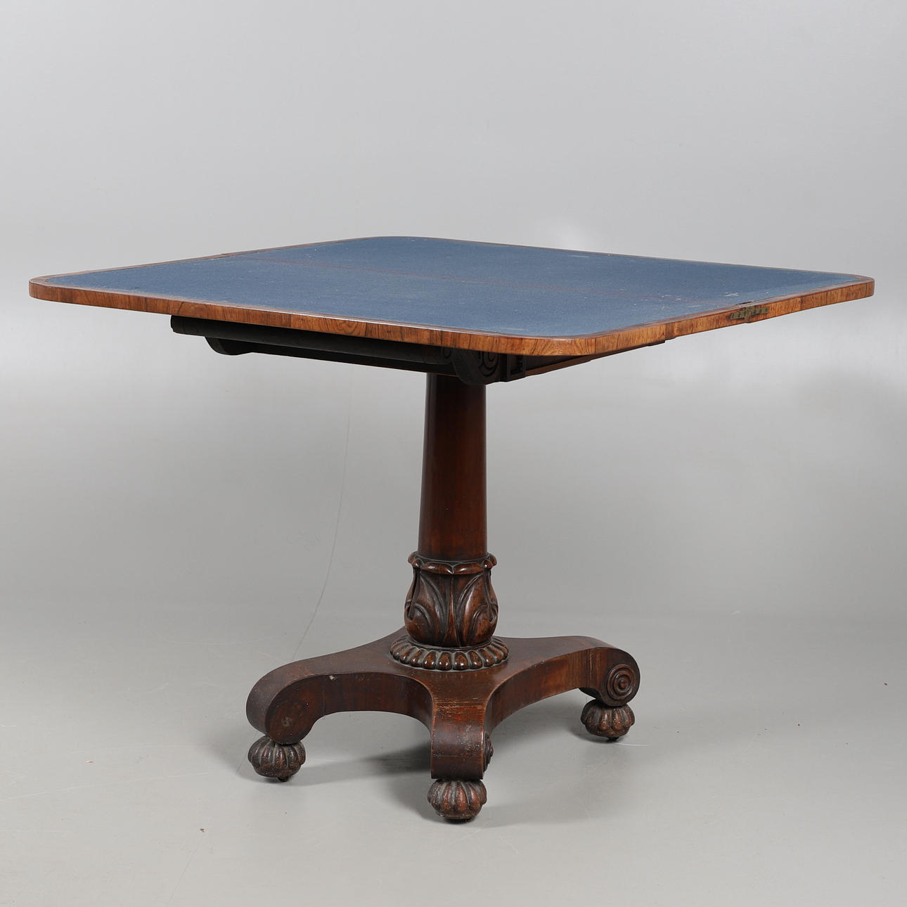 Regency Rosewood -korttipöytä, käännetyllä kapenevalla pylväällä, jossa on veistetty pohja ja levitetty nelikulmainen pohja, jossa on veistetyt lehtijalat ja upotetut pyörät. Kääntyvä yläosa ja sininen baize. Korkeus 74cm, leveys 92cm, syvyys 45cm (täysin laajennettu 90cm).