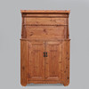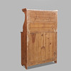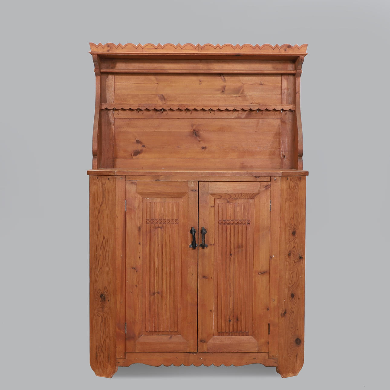 Runko männystä. Yläosassa lautashylly. Liukuva pohja ovilla. Leveys 107 cm. Syvyys 44 cm. Korkeus 164 cm.