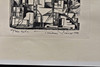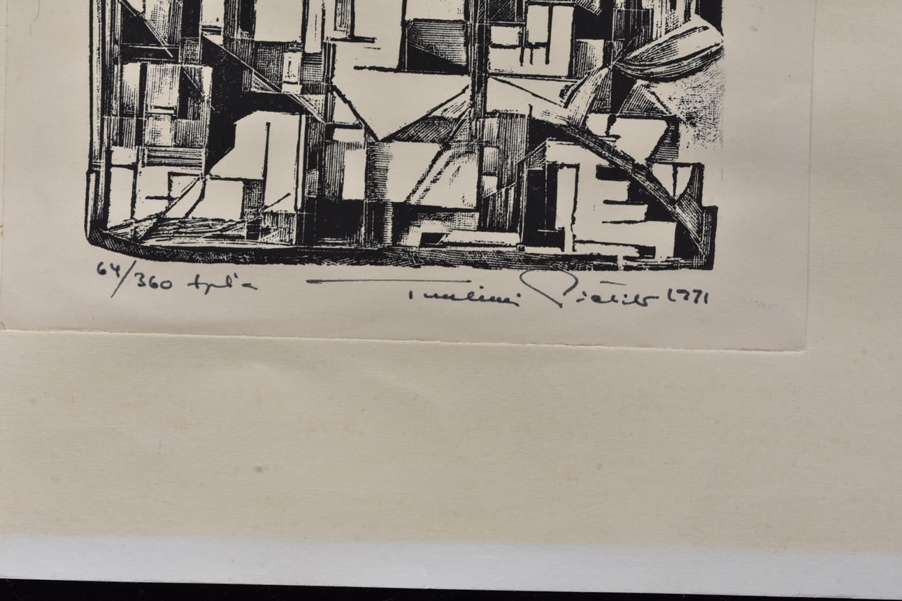 Kubistinen kaupunkikuva. Signeerattu ja numeroitu 64/360 ex. Päivämäärä 1971. 8x9,5 cm.