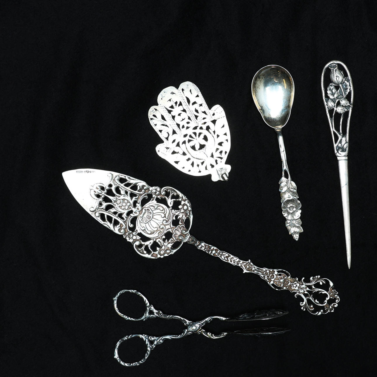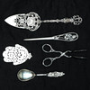 Erilaisia hopeisia ruokailuvälineitä, mukaan lukien kakkulapio ja sokeripihdit. Paino noin 147,7 grammaa.