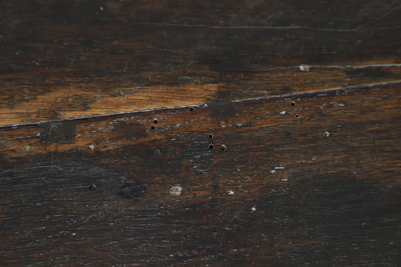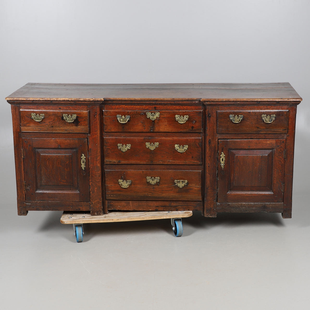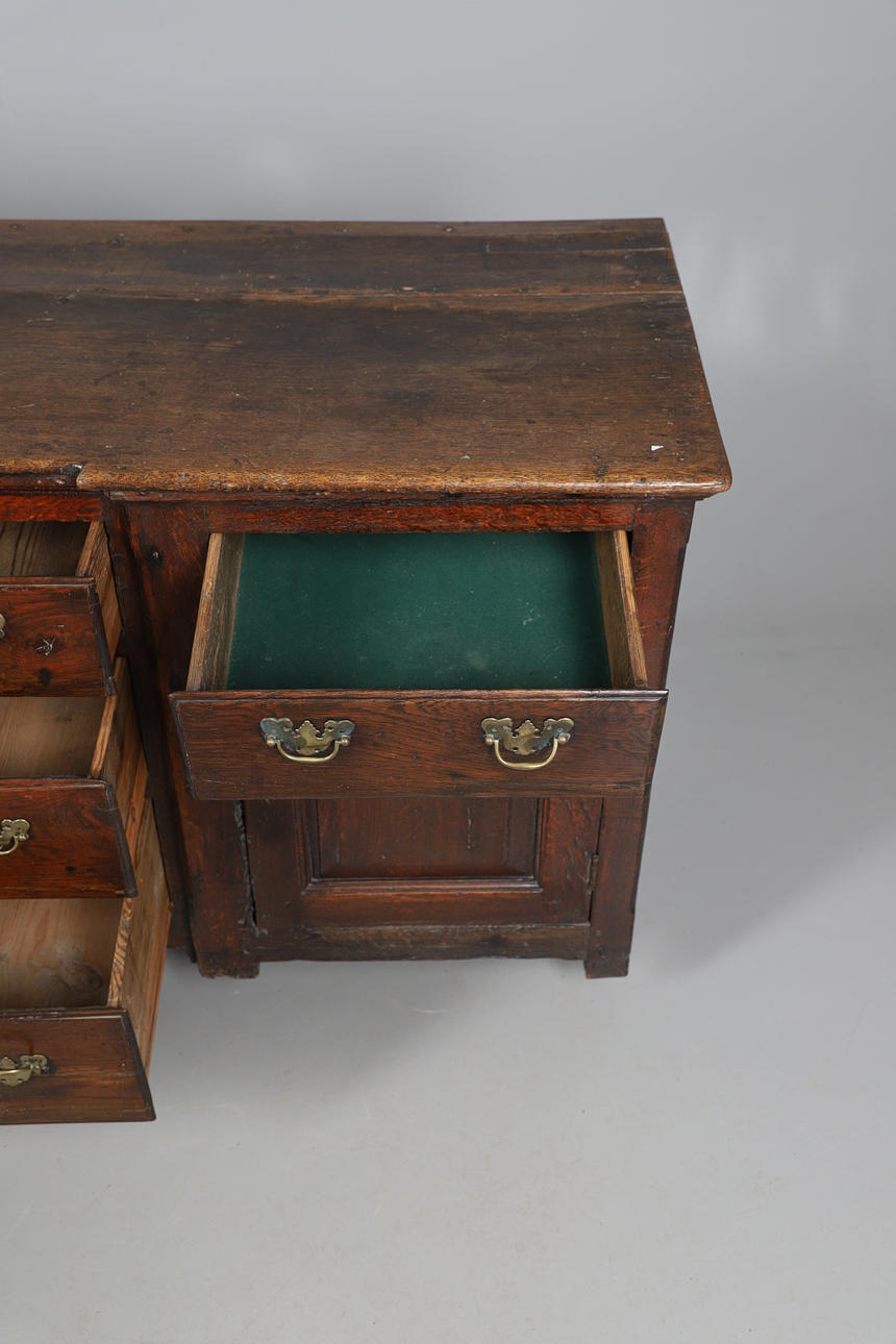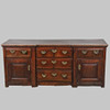 Luultavasti 1700-luvulta. Kolme asteittaista keskitettyä yksittäistä laatikoita. Kaksi yksittäistä laatikkoa kummallakin puolella kahden yksittäisen kaapin yläpuolella. Laatikot messinkivetimillä. Korkeus 74cm, pituus 171cm, syvyys 55cm. Avaimella.