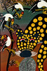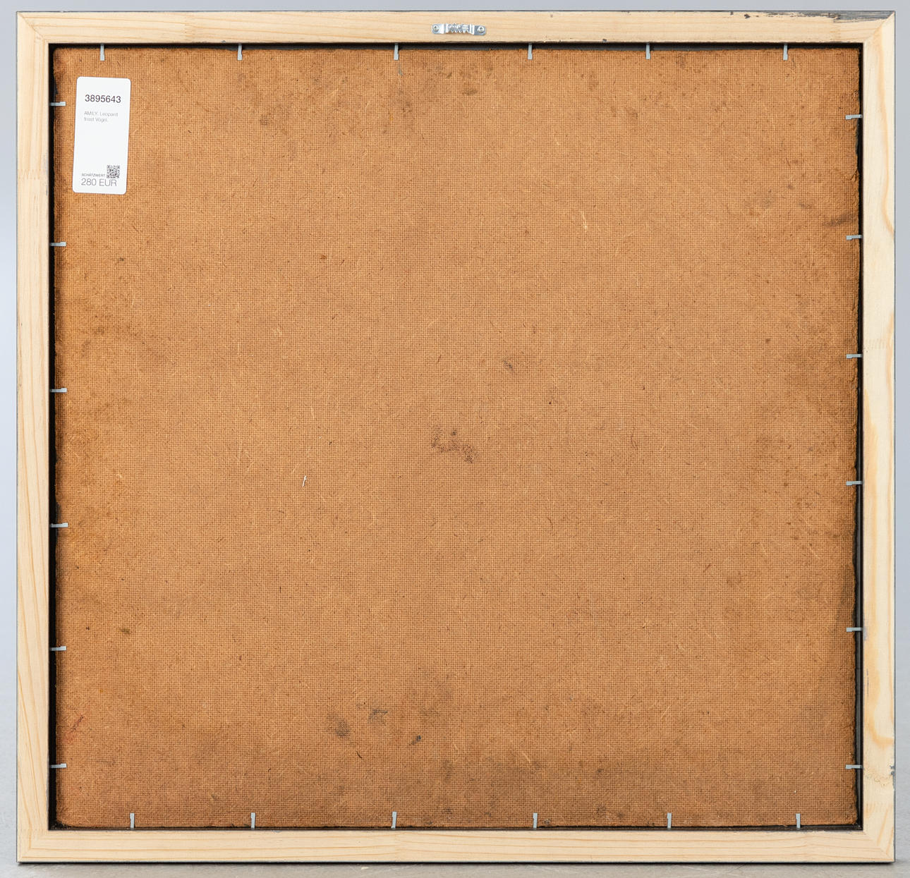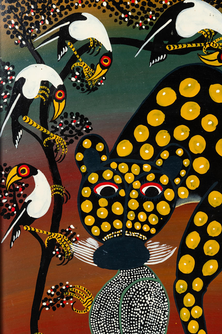 Amily, leopardi syö lintuja, lakka kovalevylle, signeerattu, kehyksellä n. 65 x 67 cm