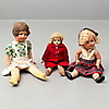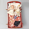 Käyttökuluma, pieniä vaurioita, punaisella mekolla varustetun nuken poskessa reikä ja vasen käsi puuttuu.