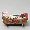 Puinen kehto kukkakoristeella, pituus 30 cm.