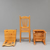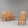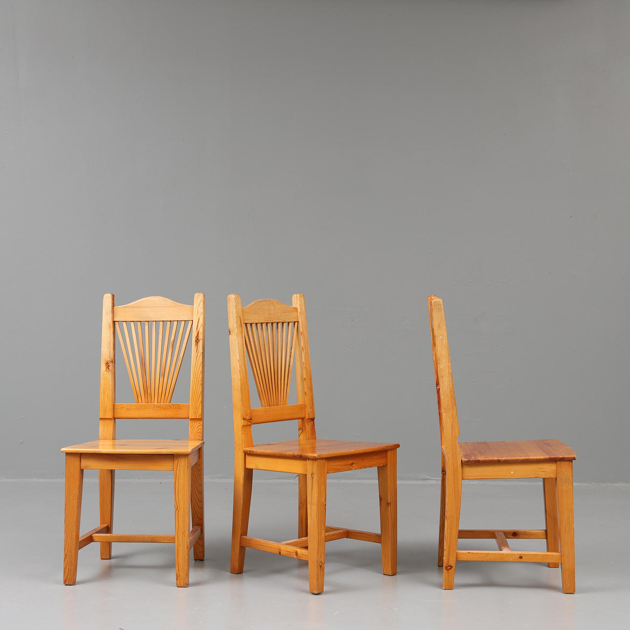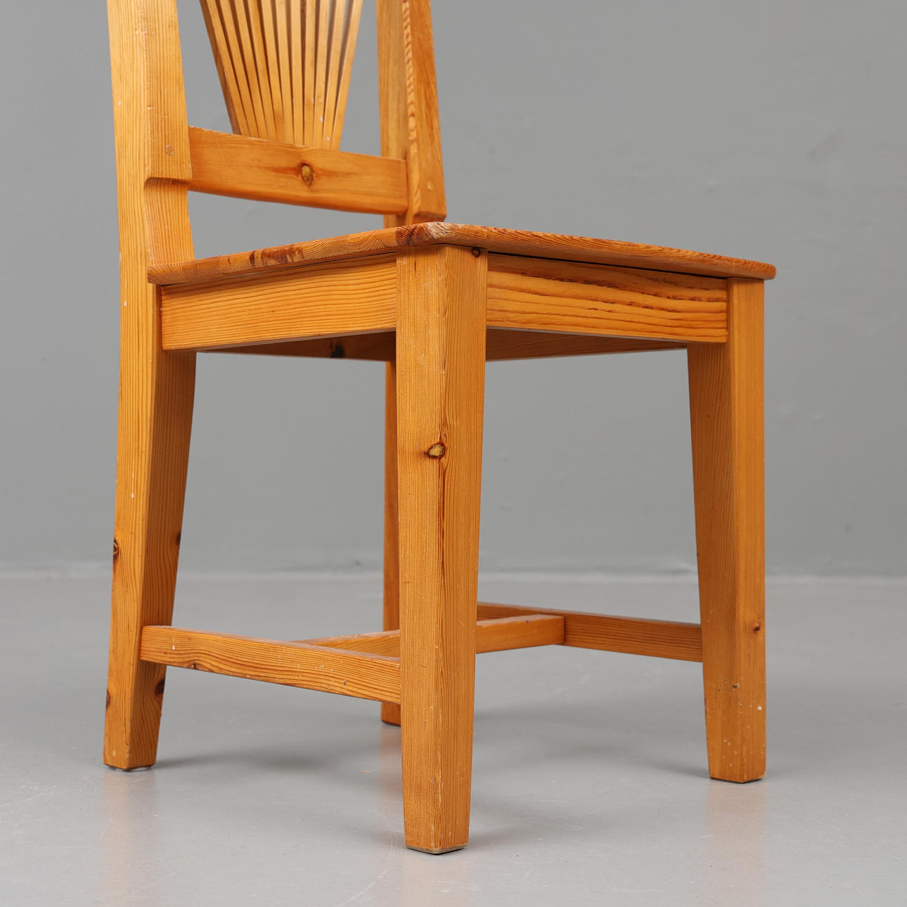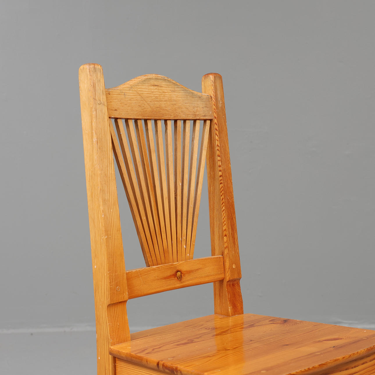 Neljä mäntytuolia, joissa on uurrettu selkä. Mitat: korkeus 95 cm, istuinkorkeus 45 cm.