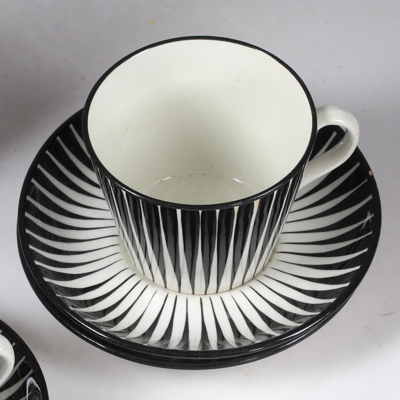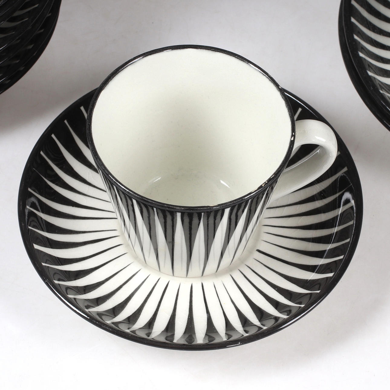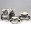 Koostuu seuraavista: 6 kahvikuppia, korkeus 6,5 cm 8 kahvilautasia, 13 cm 1 teekuppi, korkeus 7,5 cm 2 lautasta, halkaisija n. 16 cm.