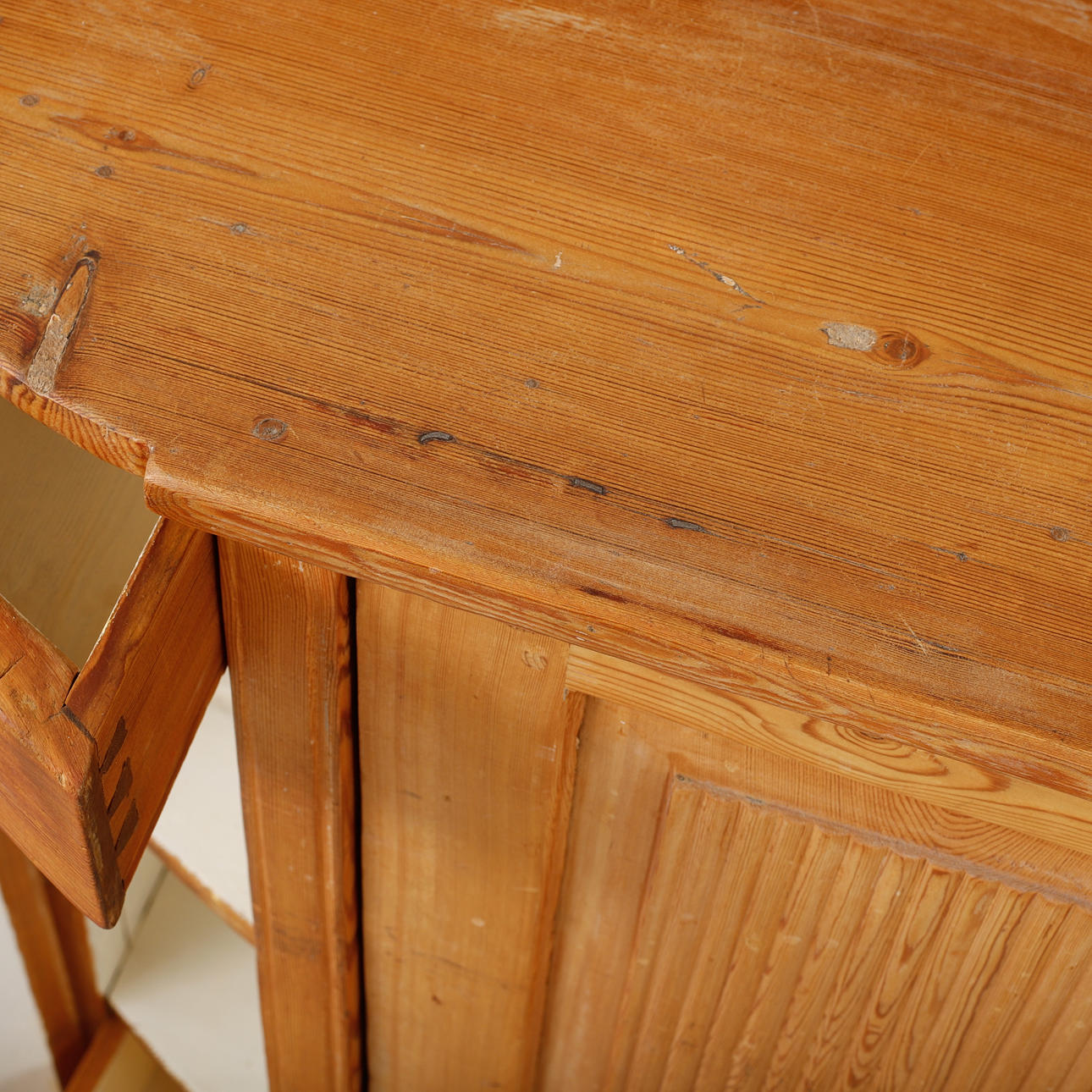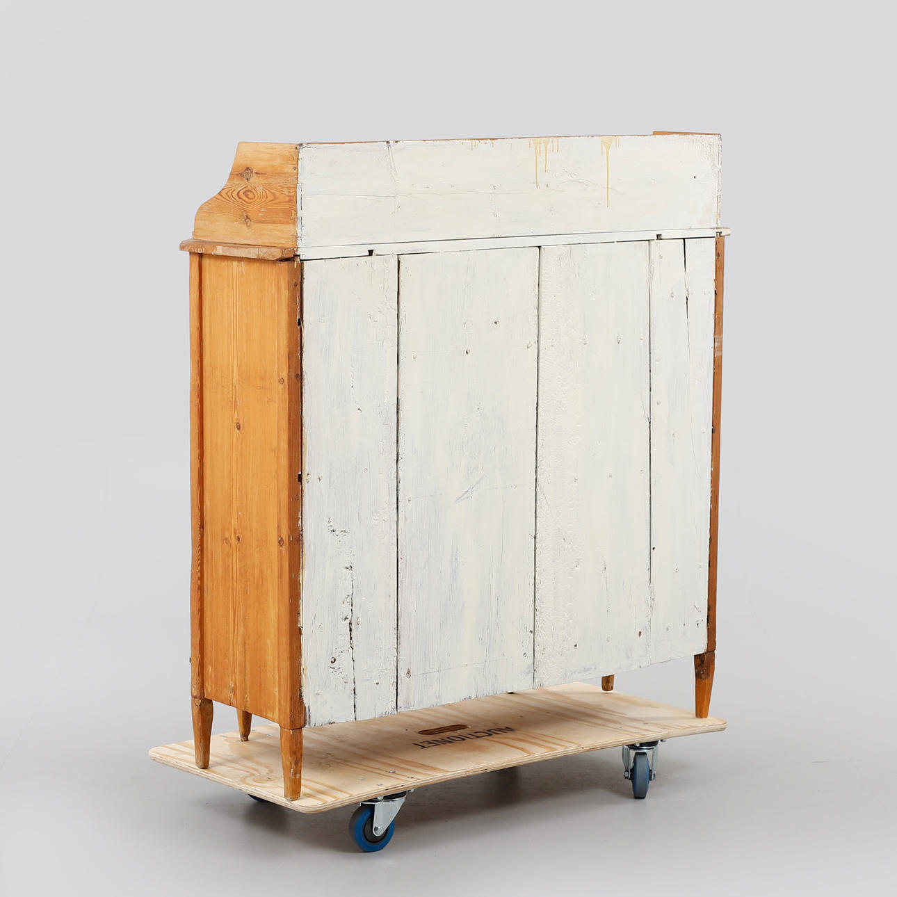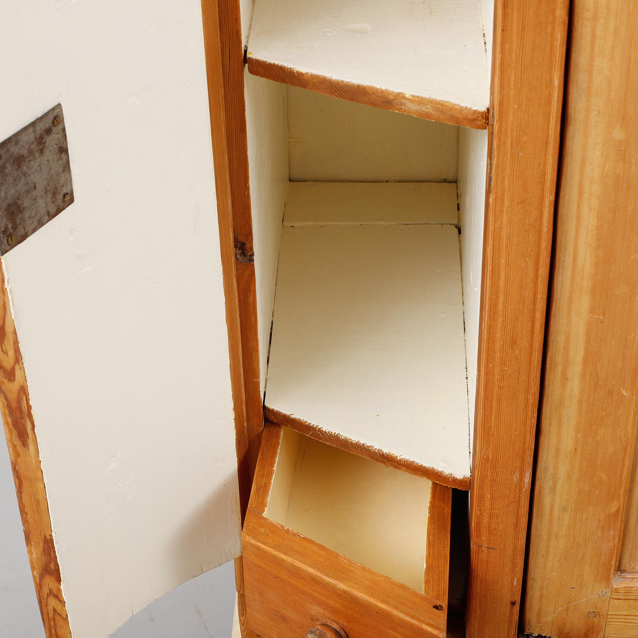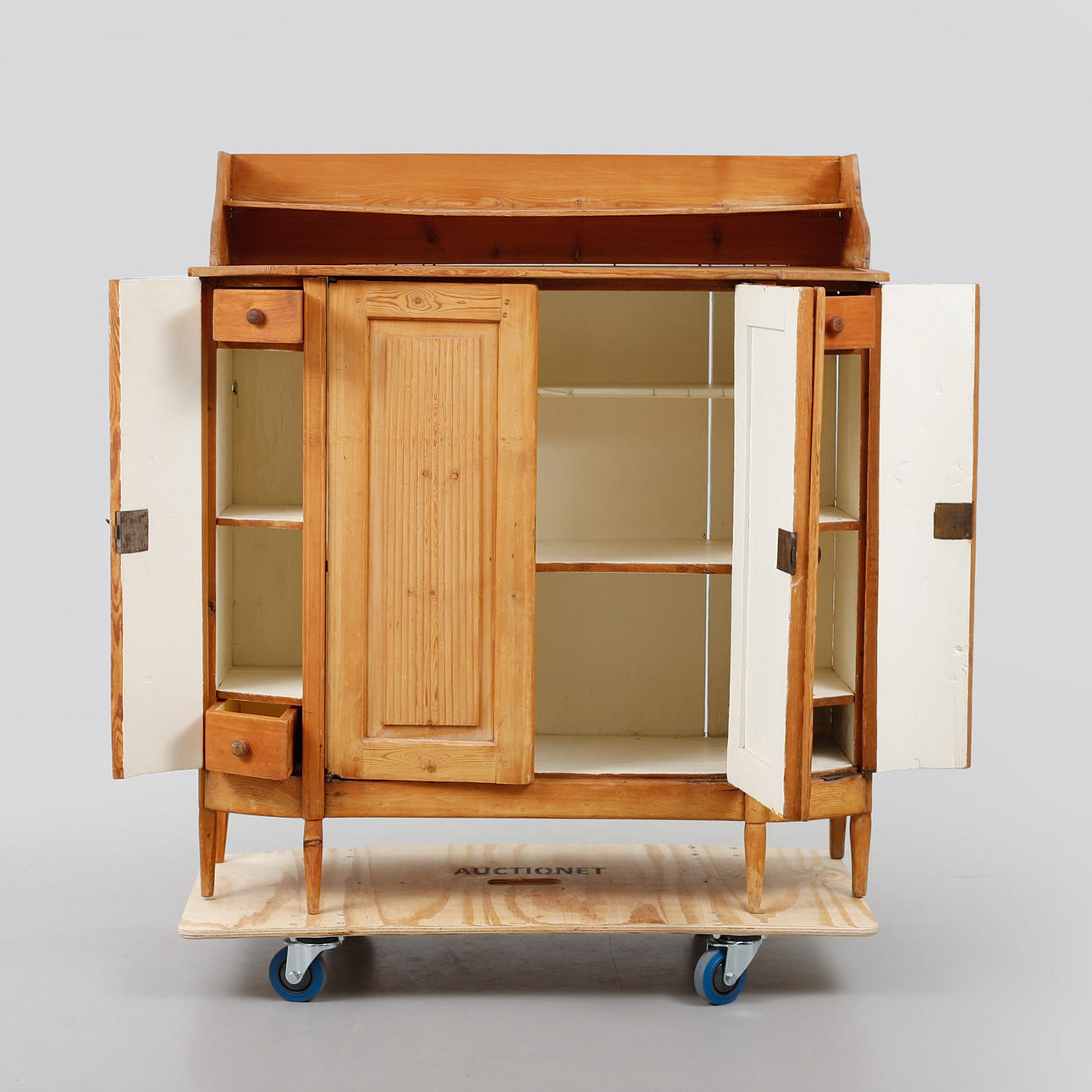 Kastettu pois. Pyöreät kulmat, joissa on hyvät renkaat ovet. Ovipari takahyllyn sisäpuolella. Pituus 124 cm, leveys 55 cm, korkeus 132 cm.