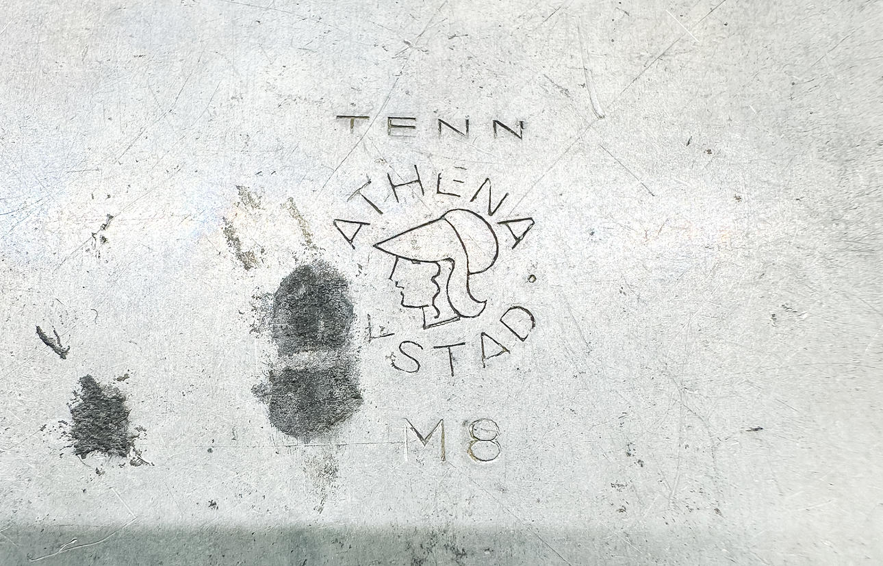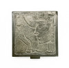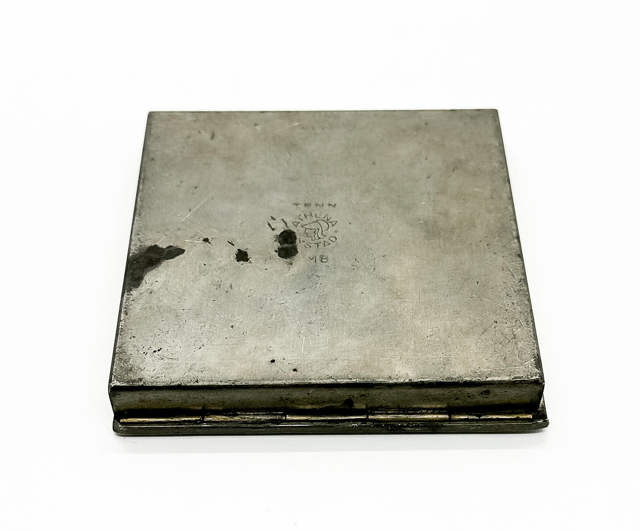 Kaiverrus kannen sisäpuolelle. Sisustus kasvojen muodossa. Mitat noin 8,5 x 8,5 cm.