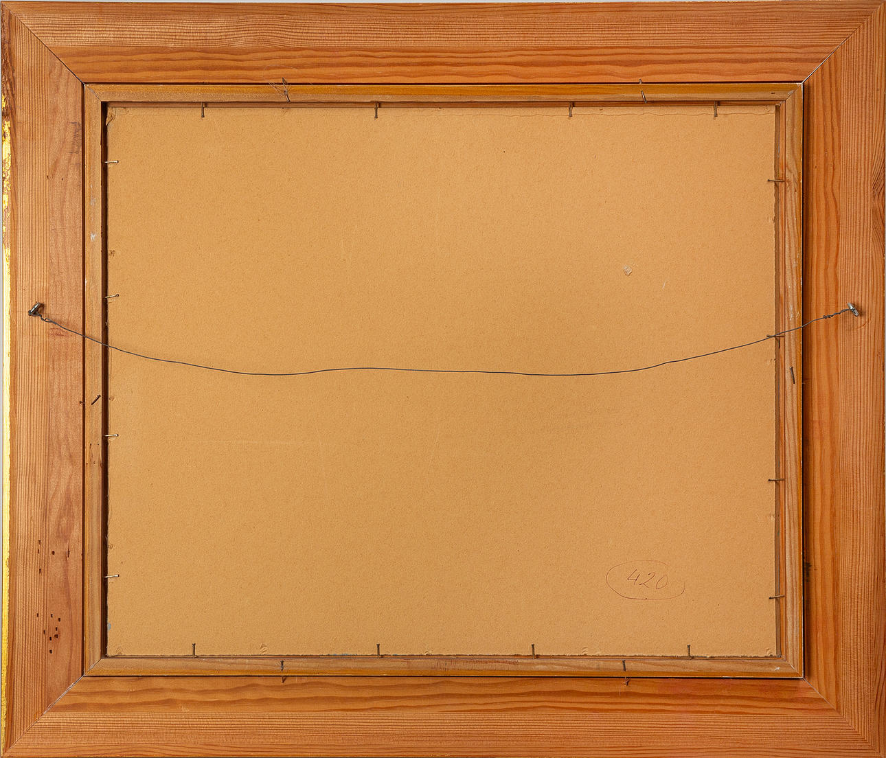 Öljy levylle, 36 x 44 cm, rungon mitat 51 x 61 cm. Signerad EÄ.