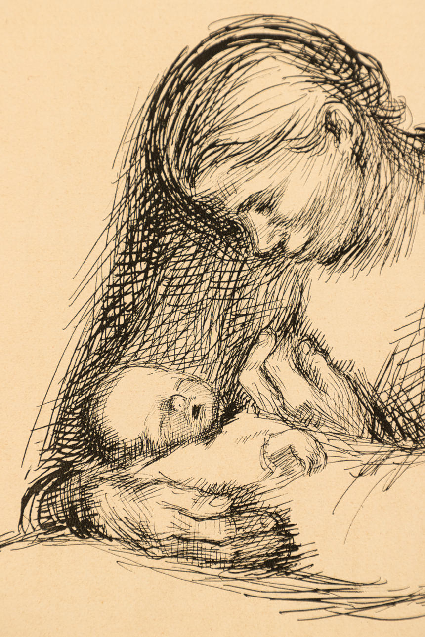 Käthe Kollwitz (1867-1945), äiti taapero sylissään, vaalea painatus vuodelta 1912 tutkimukseen perustuva painatus, signeerattu tulostusvälineellä, oikeassa yläkulmassa käsinkirjoitettu ”6”, leima ”Albert Frisch Graph”. Kunstanstalt Berlin W 35', n. 21 x 24 cm, arkin koko n. 32,5 x 36 cm.