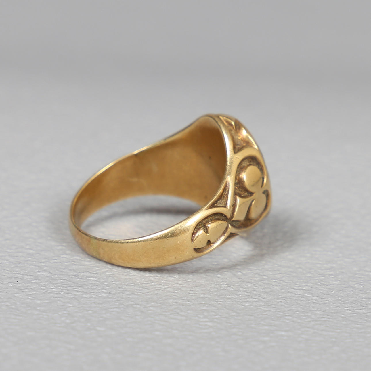 Lapis lazulilla on jonkin verran pintakulumista, joka ei vaikuta kaiverrukseen. Kehyksen asetuksella on jonkin verran kulumista, mutta kivi näyttää turvalliselta.