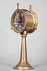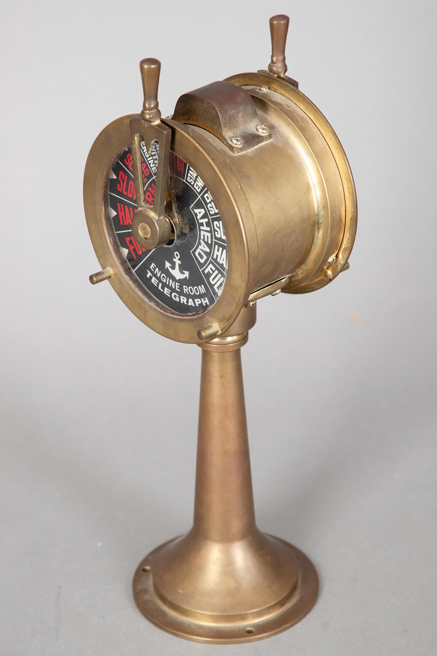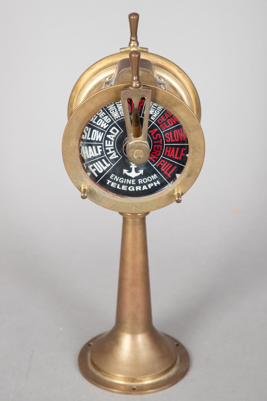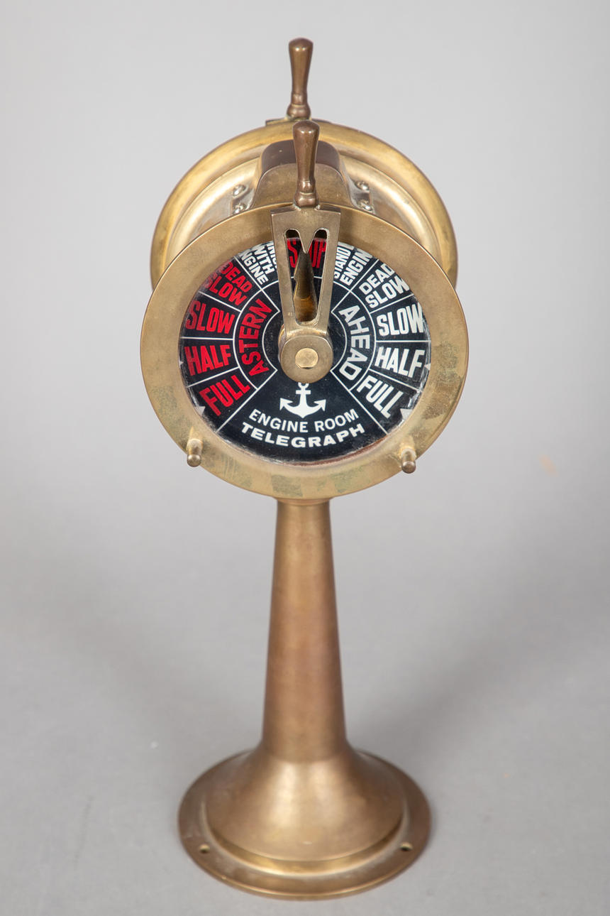 Messinkiä ja lasia. Pyöreä vipu kartiomaisessa pylväässä. Komennot punaisella ja valkoisella mustalla taustalla. Ei integroitua kellojärjestelmää. Ei sähköistetty. H. n. 37 cm.
