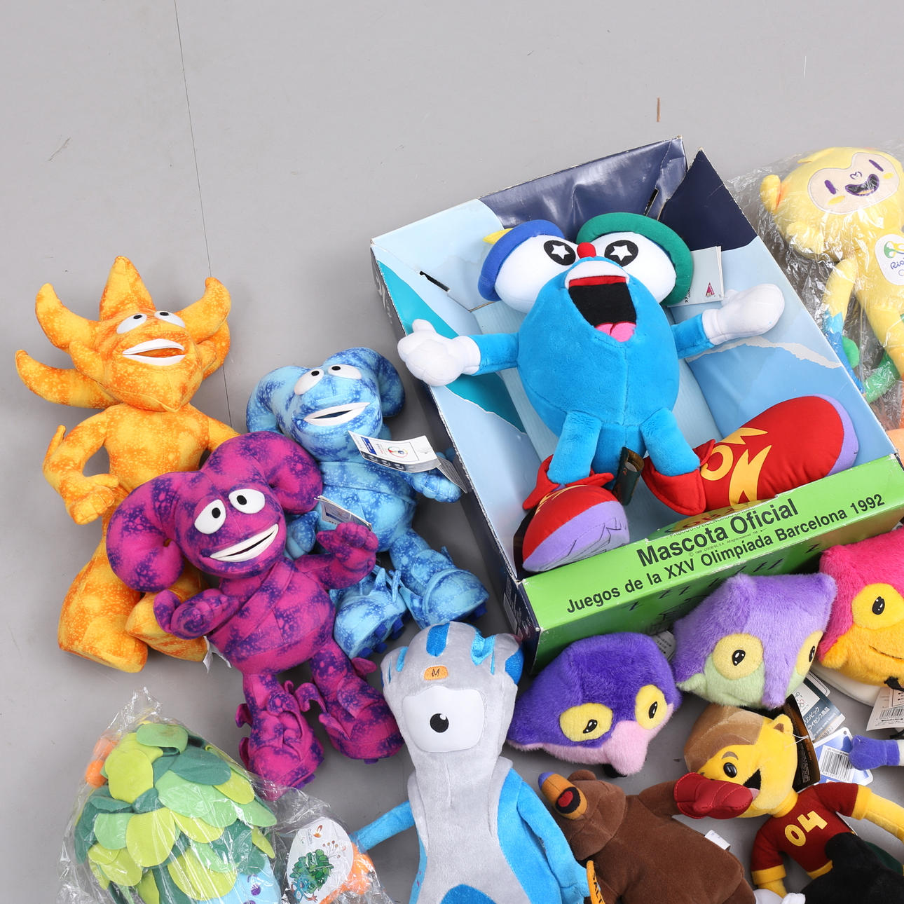 2 muhkea ”Cobi”, Barcelonan olympialaisten virallinen maskotti, 1992. Korkeus n. 34 ja 18 cm.