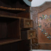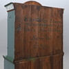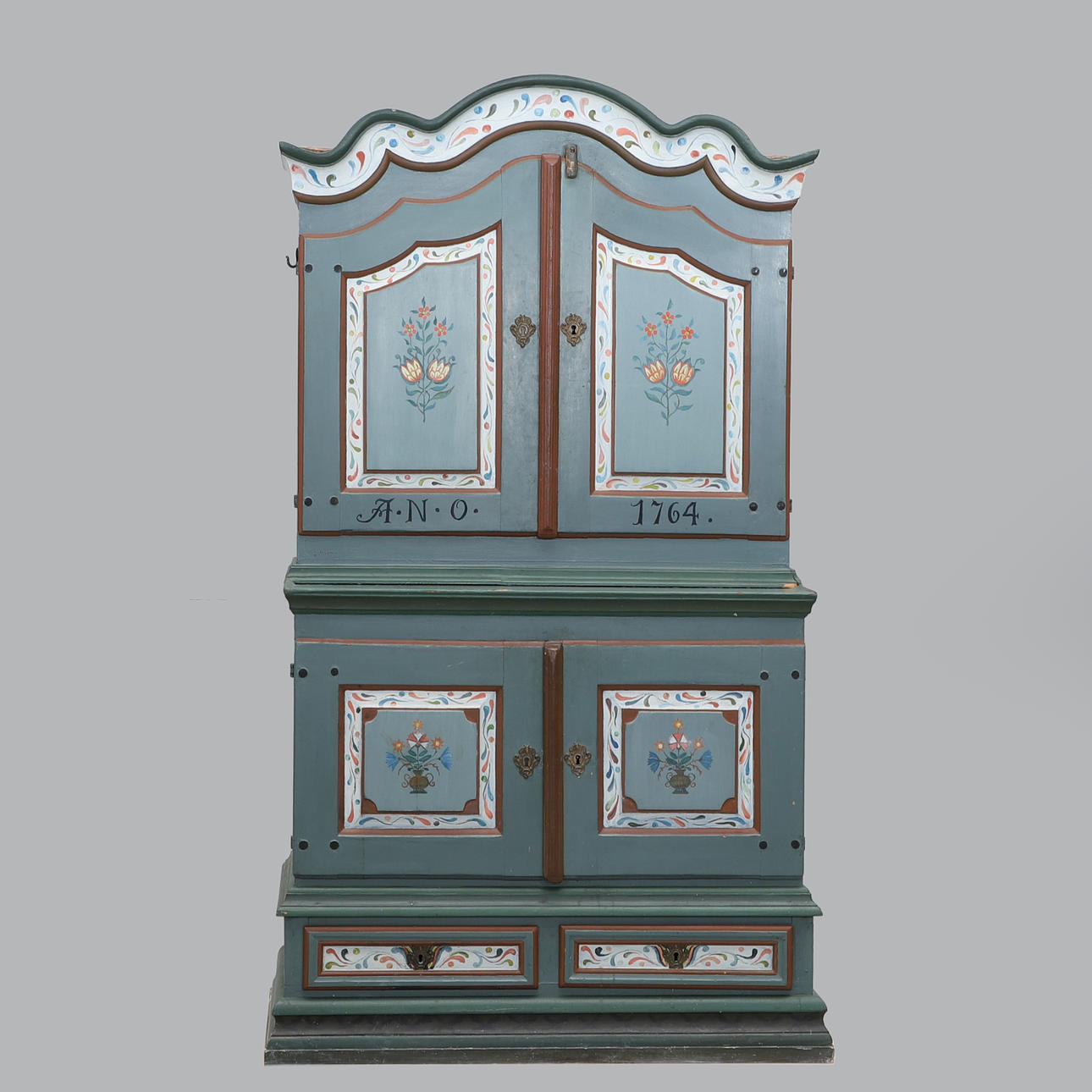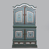 Kaksiosainen. Maalattu mänty. Ylöspäin käännetty kruunu, edessä neljä ovea ja kaksi laatikkoa. Sisustus hyllyillä ja laatikoilla. Leveys 110, syvyys 54, korkeus 193 cm.