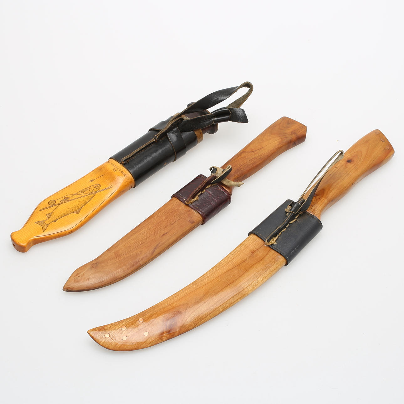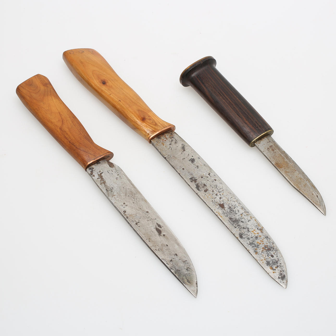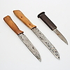 2 veistä puukotelolla ja kuparisilla yksityiskohdilla pituus 30 ja 37 cm.