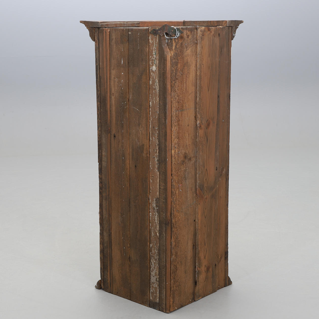 Maalattu mänty. Suora muoto, ulkoneva harja, kapea ovi. Leveys 72 cm. Syvyys 54 cm. Korkeus 120 cm.