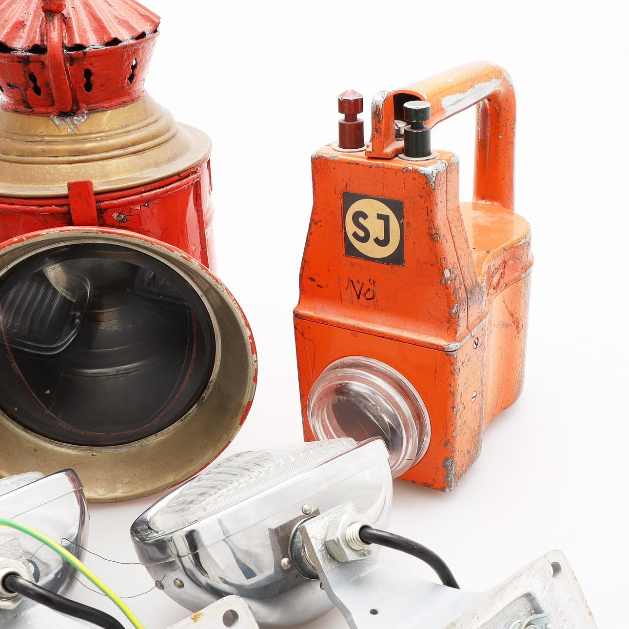 Lyhty, SJ, korkeus 20 cm. Lyhty, korkeus 32 cm. Ajovalot, yksi pari, mitat/kpl 12x13x14 cm. Lyhty, Radsonne, korkeus 21 cm.