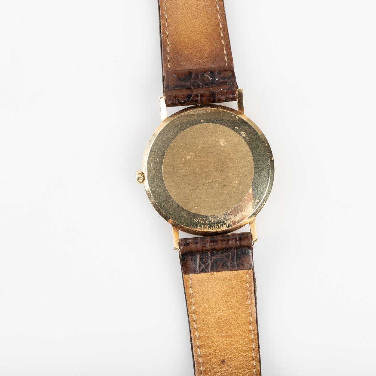 Hopeanvärinen kellotaulu, jossa indeksi, sekuntiosoitin ja päivämäärä. Halkaisija noin 34 mm. Mukana nahkaranneke, kullattu joustava lenkki ja alkuperäinen laatikko.