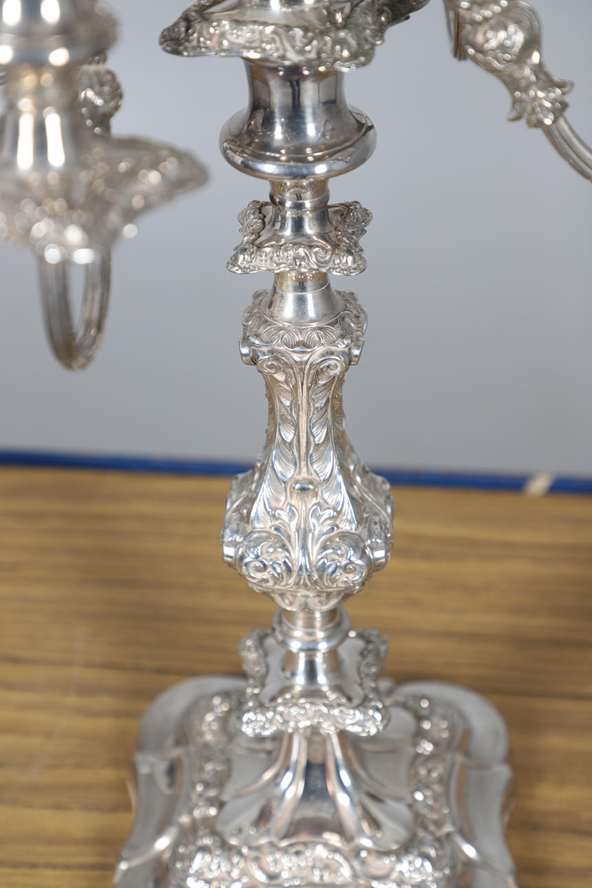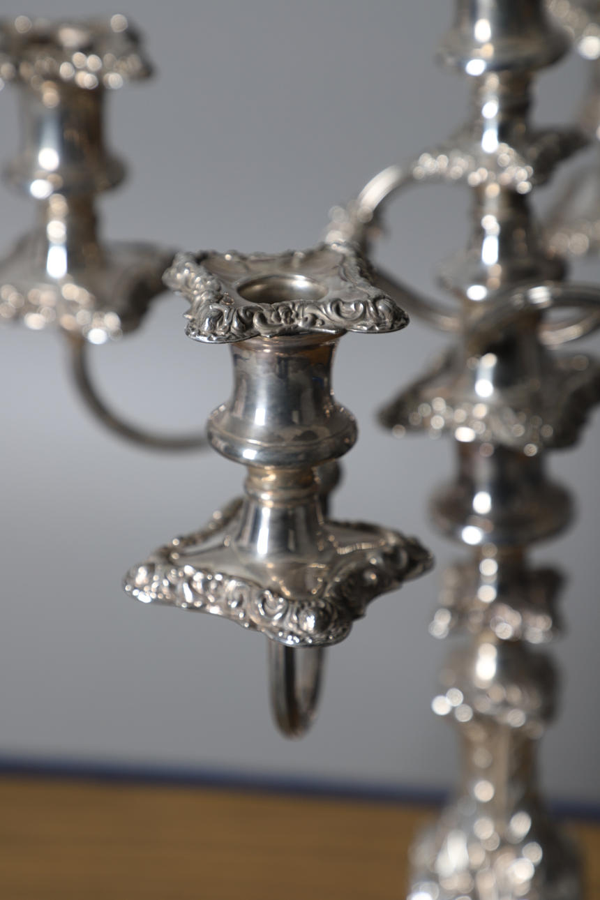 jossa on viisi kynttilälamppua, kaikki nostettu keskipylvääseen, jossa on valettu lehtikoristelu, korkeus 48 cm.