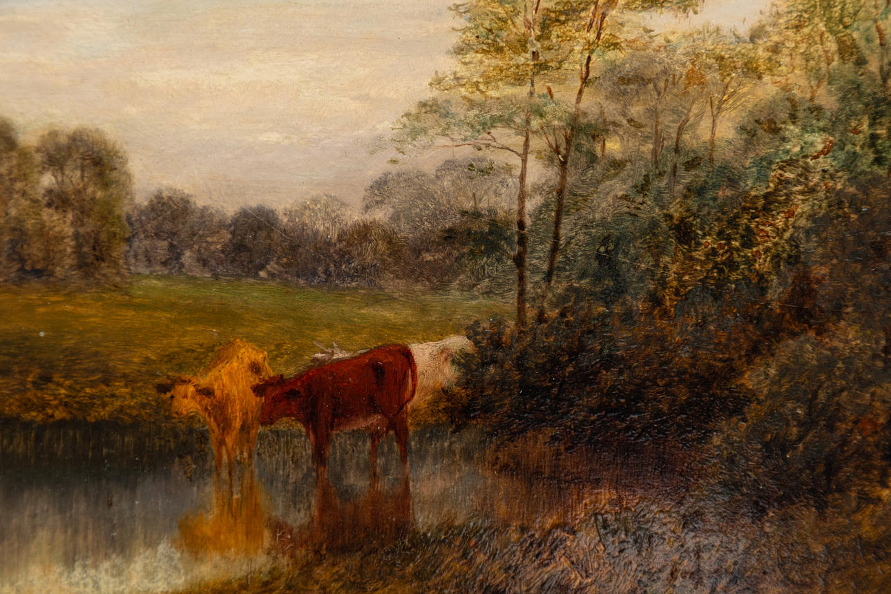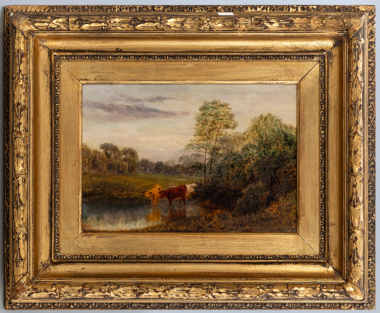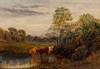 Charles Blacklock (? - 1893), Ilta - Maisema lehmillä vesikolla, öljy levylle, noin 1880, signeerattu oikealla alhaalla ja päivätty huonosti luettavissa, n. 17,5 x 25,5 cm, kehyksellä n. 35 x 43 cm.
