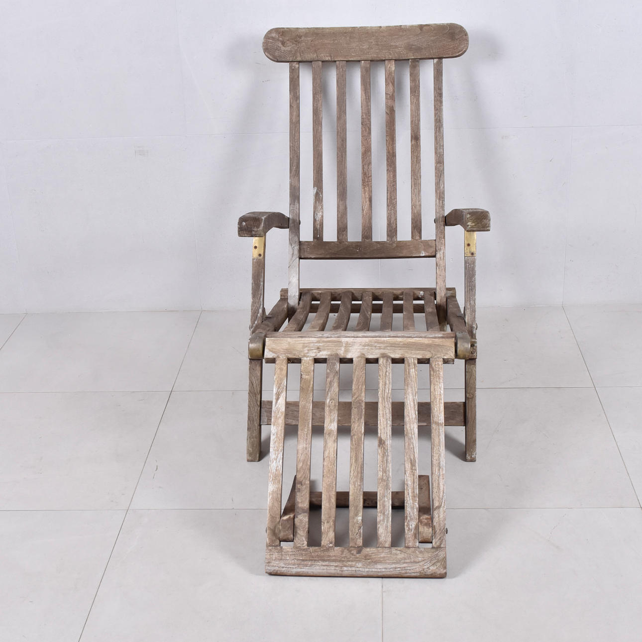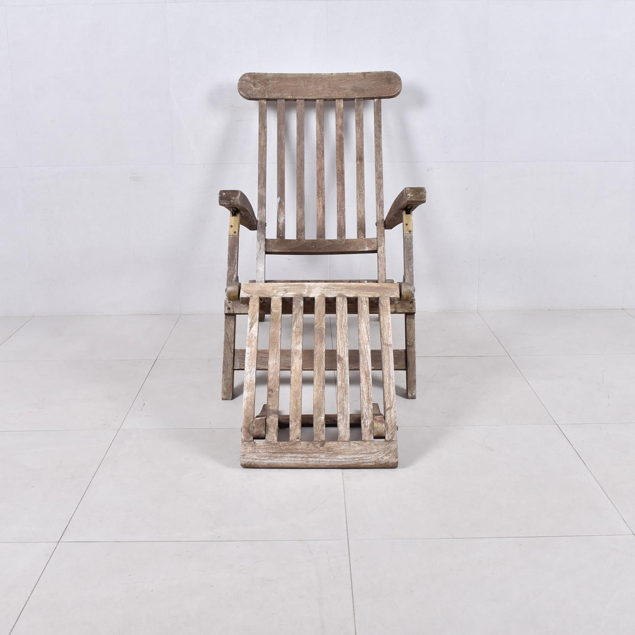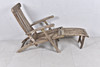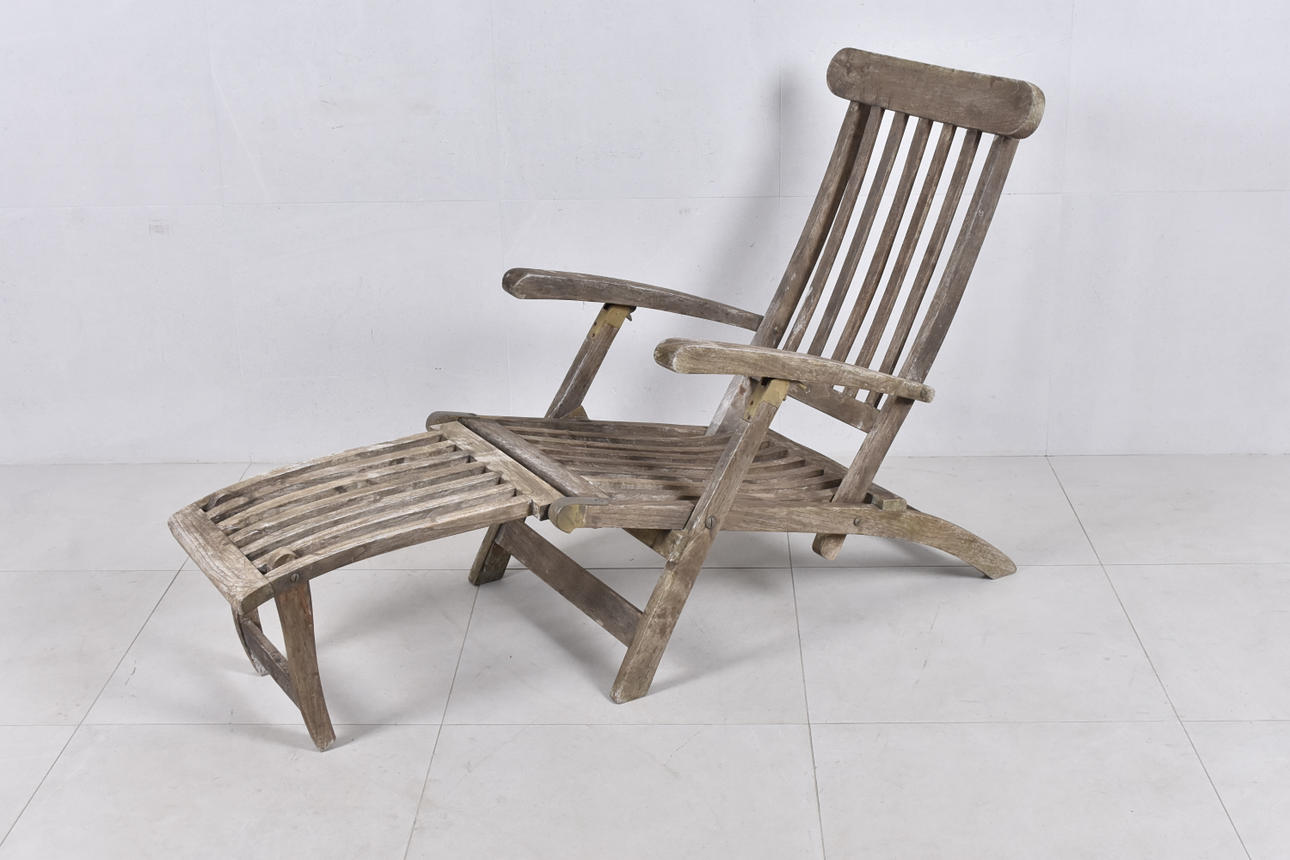 Tiikki messinkiyksityiskohdilla. Selkä on säädettävissä. Taitettava. Kokonaispituus 160 cm.