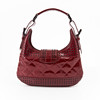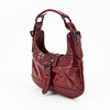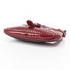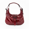 Punaista lakattua nahkaa, osittain tikattu, nastat ja soljet mustattua metallia, vuorattu mustalla ruudullisella tekstiilillä, sisäpuolella lokerot, merkintä ”Burberry”, mitat n. 30x19x3cm.