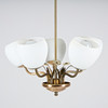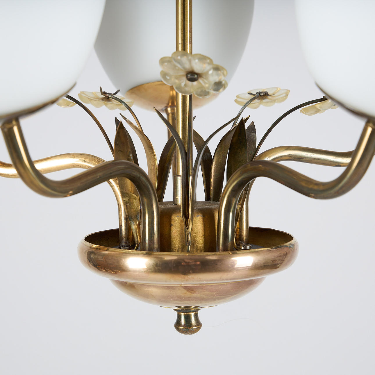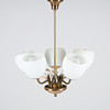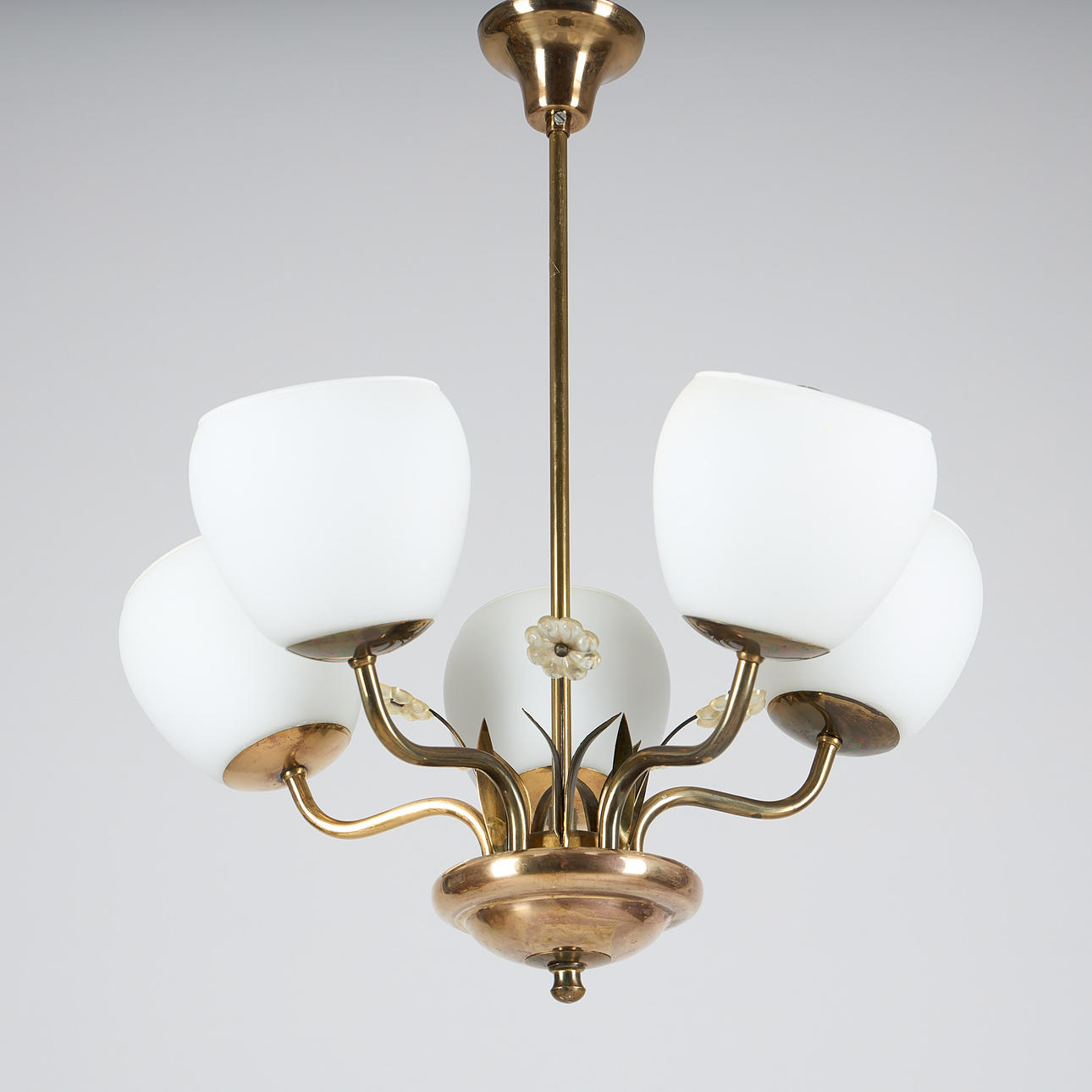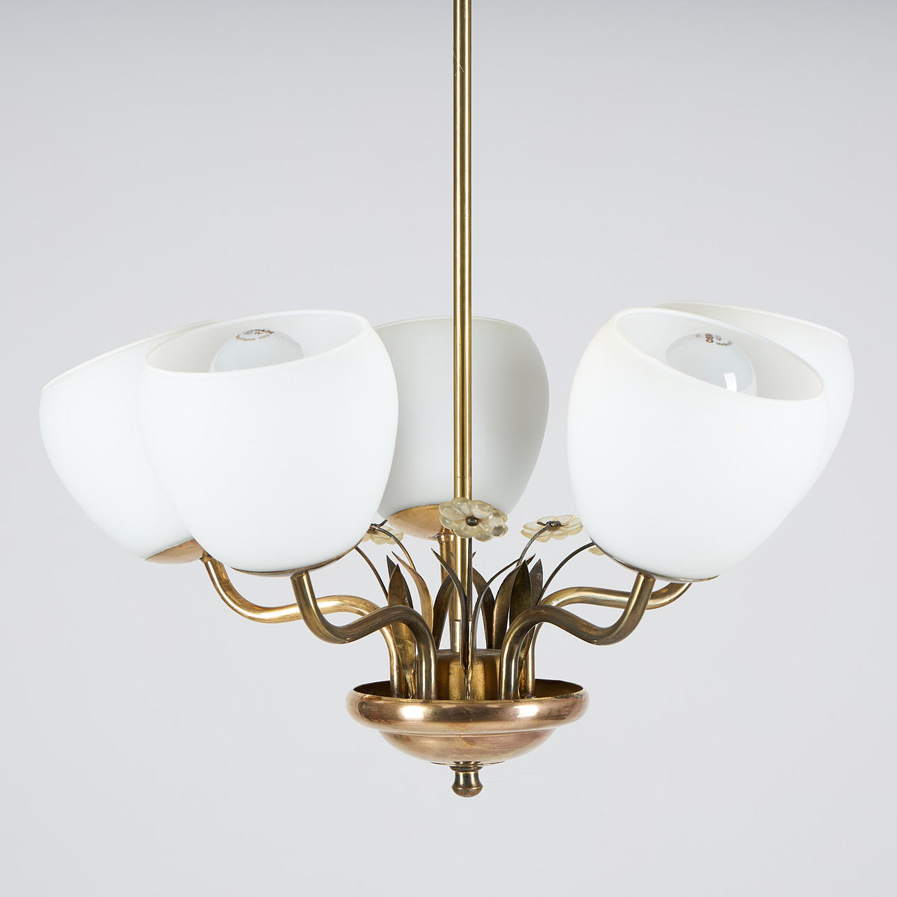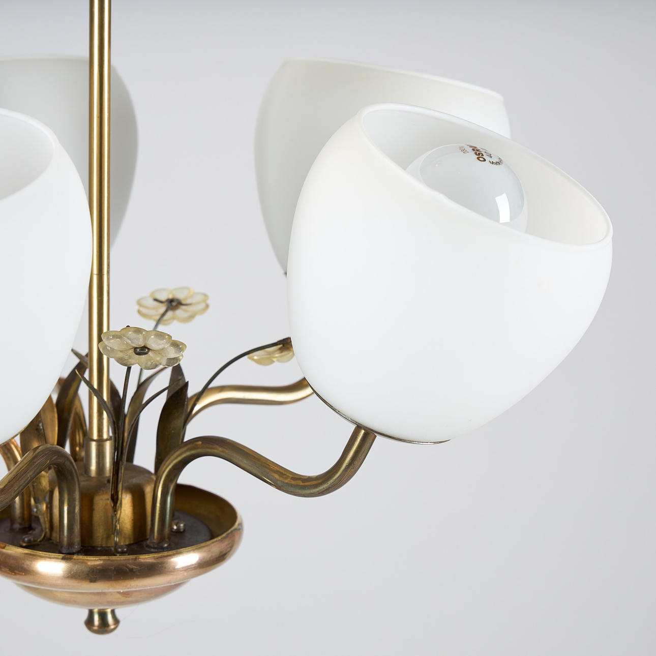 Kiillotettu messinki, viisi kynttilänvartta, lasikukat ja opaalilasikuvut. Korkeus 53 cm, halkaisija 48 cm.