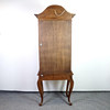 Puinen pöytä, rocailles-sisustus, levenevät jalat leijonan tassuilla. Puinen vitriini, kaareva muoto kruunulistoilla. 3 hyllyä lasissa. Sisäänvedetty sähkö valaistuksella.