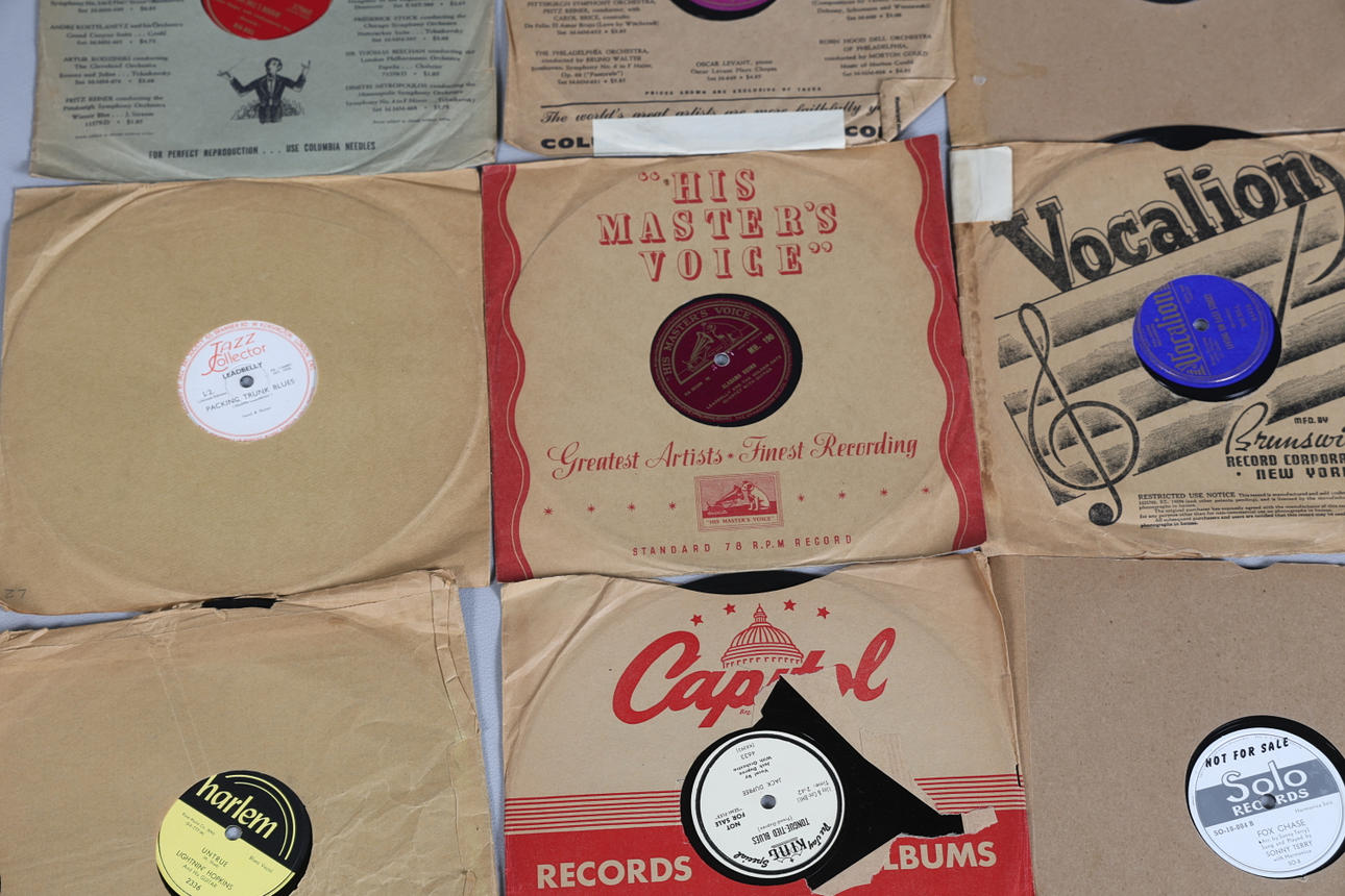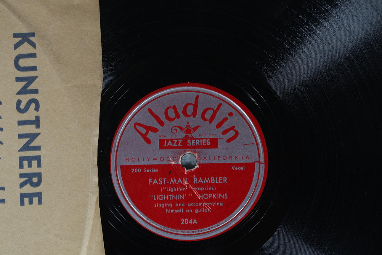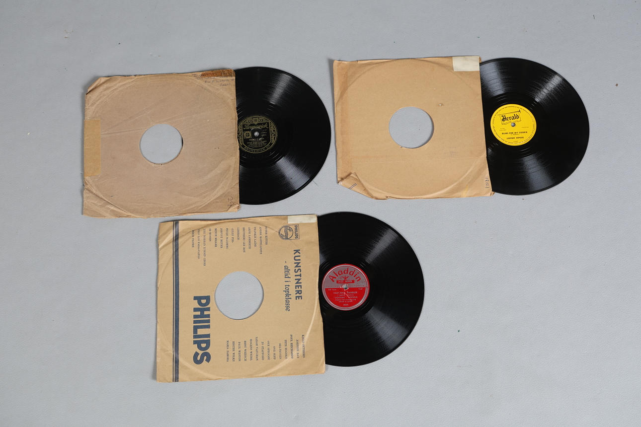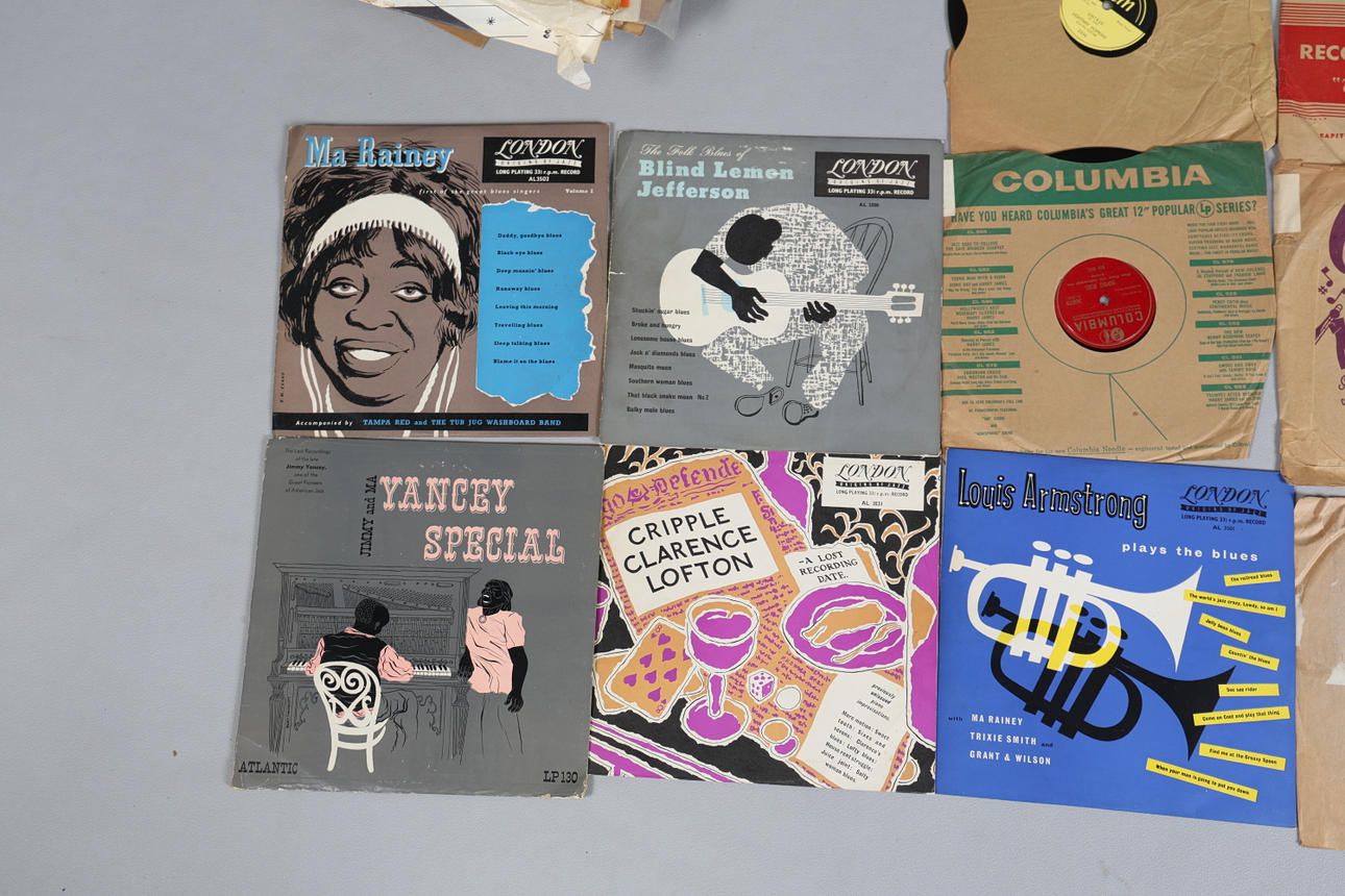Hyvä kokoelma Shellac 78's ja 10" vinyylejä, joihin kuuluvat ”Lightnin'" Hopkins - Fast-Mail Rambler/Thinkin' And Worryin' (204), Lightnin' Hopkins - Blues For My Cookie/Had A Gal Called Sal (H-465), Sister Rosetta Tharpe And Marie Knight/Sister Rosetta Tharpe - Didn't It Rain/Two Little Fishes And Five Loaves Of Bread (04851), Sonny Terry - huuliharppu- ja laulusoolot (FP 35), Ethel Waters - Sinisen sävyt (RLP-1025), Kid Ory's Creole Jazz Band - 1953 (L.D.G. 093), Louis Armstrong - Soittaa Bluesia (AL 3501), Louis Armstrong ja hänen orkesterinsa - naurava Louis (DLP 1036), 'Fats' Waller - rytmi ja romanssi (DLP1056), 'Fats' Waller ja hänen rytminsä - 'Fats' Wallerin suosikit (DLP 1008), Jelly Roll Morton ja hänen Red Hot Peppers (DLP 1016), Lizzie Miles Sam DeKemelin kanssa - Lizzie Miles (SLPY 150), Bunk Johnson ja Yerba Buena Jazz Band - Spirituaalit ja jazz (LDG 110), Lionel Hampton ja hänen kaikki tähtensä - Hamp Pariisissa - osa 2 (EDL 87008), Lead Belly - Leadbelly Memorial Volume 3 (SLP 48), Leadbelly - Leadbelly - Leadbelly Memorial Volume 4 (SLP 51), Jimmy Yancey - pianosoolot (ALS 134), Blind Lemon Jefferson - Sokean Lemon Jeffersonin kansanblues (AL 3508), Jimmy And Ma - Yancey Special (LP130), Ma Rainey - Ensimmäinen suurista blueslaulajista osa 1 (AL 3502), Cripple Clarence Lofton - Kadonnut äänityspäivä (AL 3531), Renaud Henri - Uusi ääni ”Bœuf Sur Le Toit” -tapahtumassa (L 87003), Sonny Terry - Folk Blues (L.D.E. 137), Alberta Hunter - Chirping The Blues/Someone Else Will Take Your Place (12017, ruskea Shellac), Ma Rainey And Her Georgia Band - New Boweavil Blues/Moonshine Blues (L 42), Big Bill - Roll Them Bones/Humble Blues (36879), Lightnin' Hopkins And His Guitar - Trunk Good Old Woman/Untrue (2336), Leadbelly - All Out And Down/Packing Blues (L2), Leadbelly ja Golden Gate -kvartetti - Valitse puuvillapaali/Alabama Bound (MH. 190), Big Bill Broonzy - Five Feet Seven/I Wonder (8126) ja paljon muuta. (määrä).