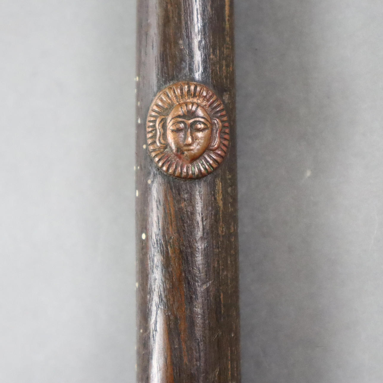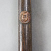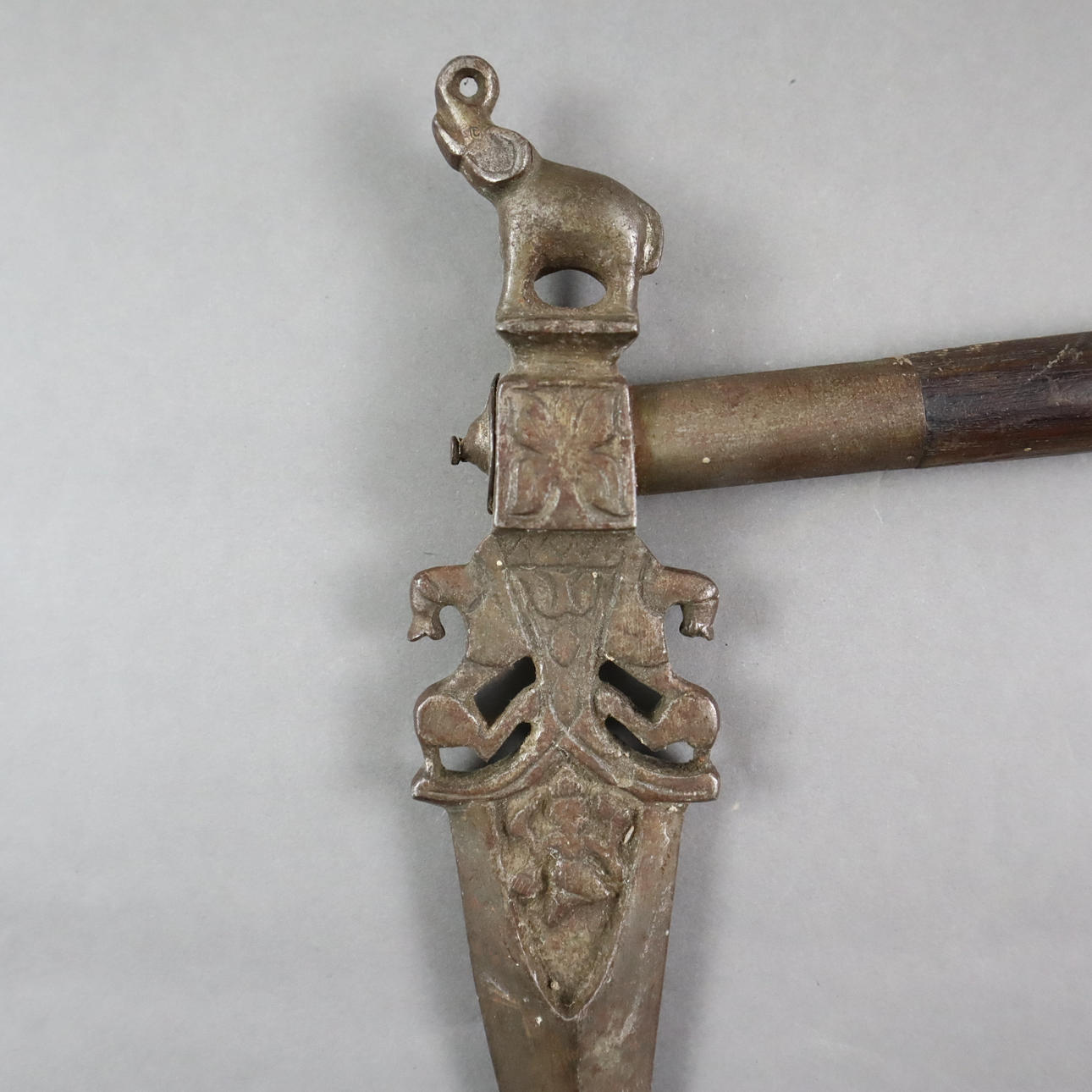 Zaghnal/Streithammer - Intia, Deccan? , n. 1800-luku, rautaa, hieman kaareva kaksiteräinen terä, jossa molemmilla puolilla keskiharjanne, koristeltu nelikätisellä jumaluudella, leijonapari ja kukkaelementti, täysi pyöreä norsuhahmo korotetulla rungolla takana, pyöreä puinen varsi napinmuotoisilla kuparikerroksilla, kokonaispituus/ leveys terä n. 24.5/5 cm, varsi läpiviennillä n. 51 senttimetriä.