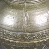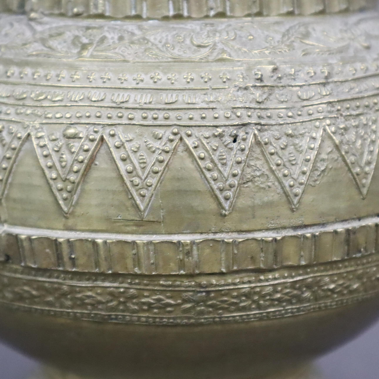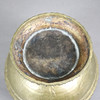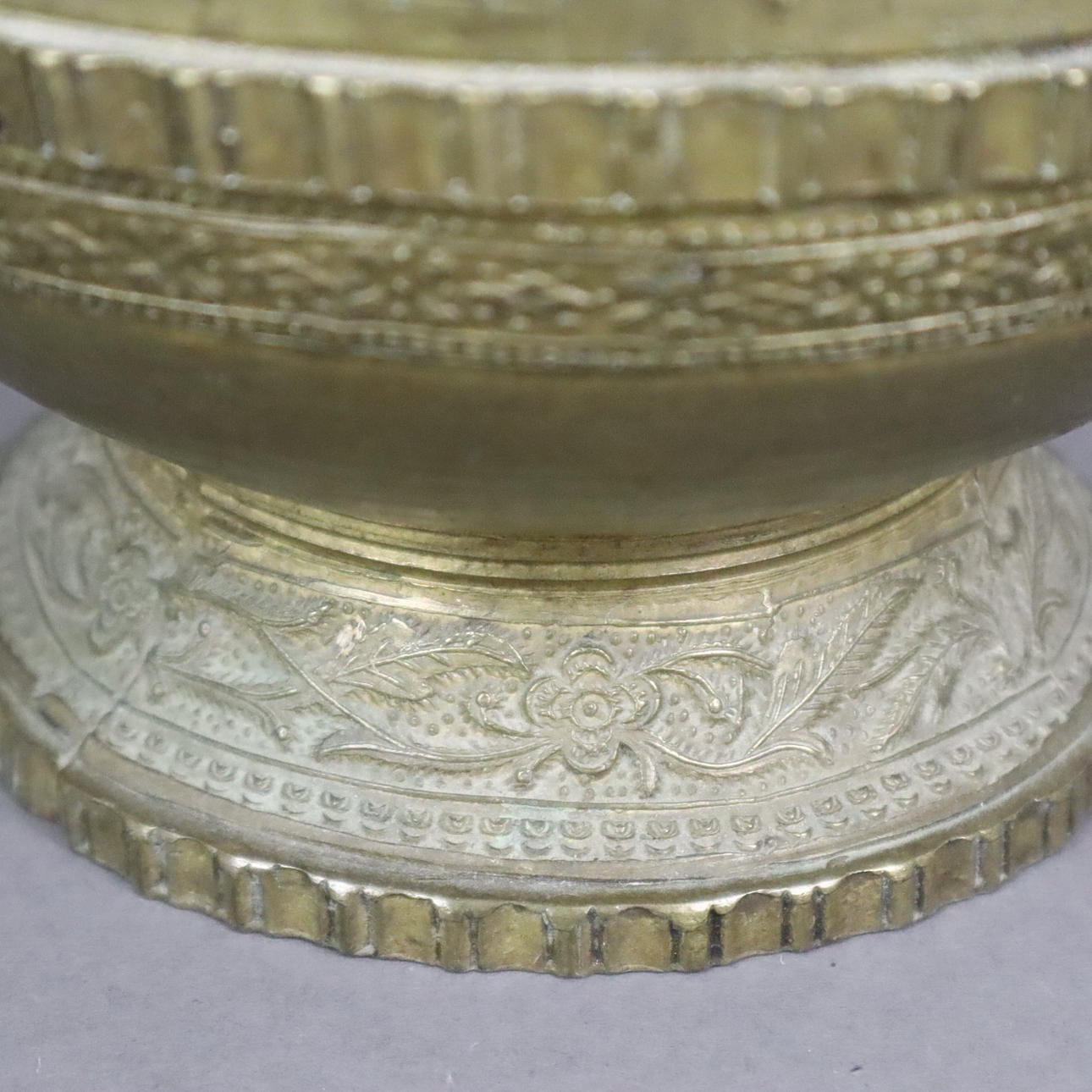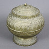 Kannellinen astia - keltainen valurauta, Intia. pallomainen seinä levenevällä pohjalla, tulpan kansi, runko koristeltu koristefriiseillä, korkeus n. 19,5 cm, paino n. 1334 g.